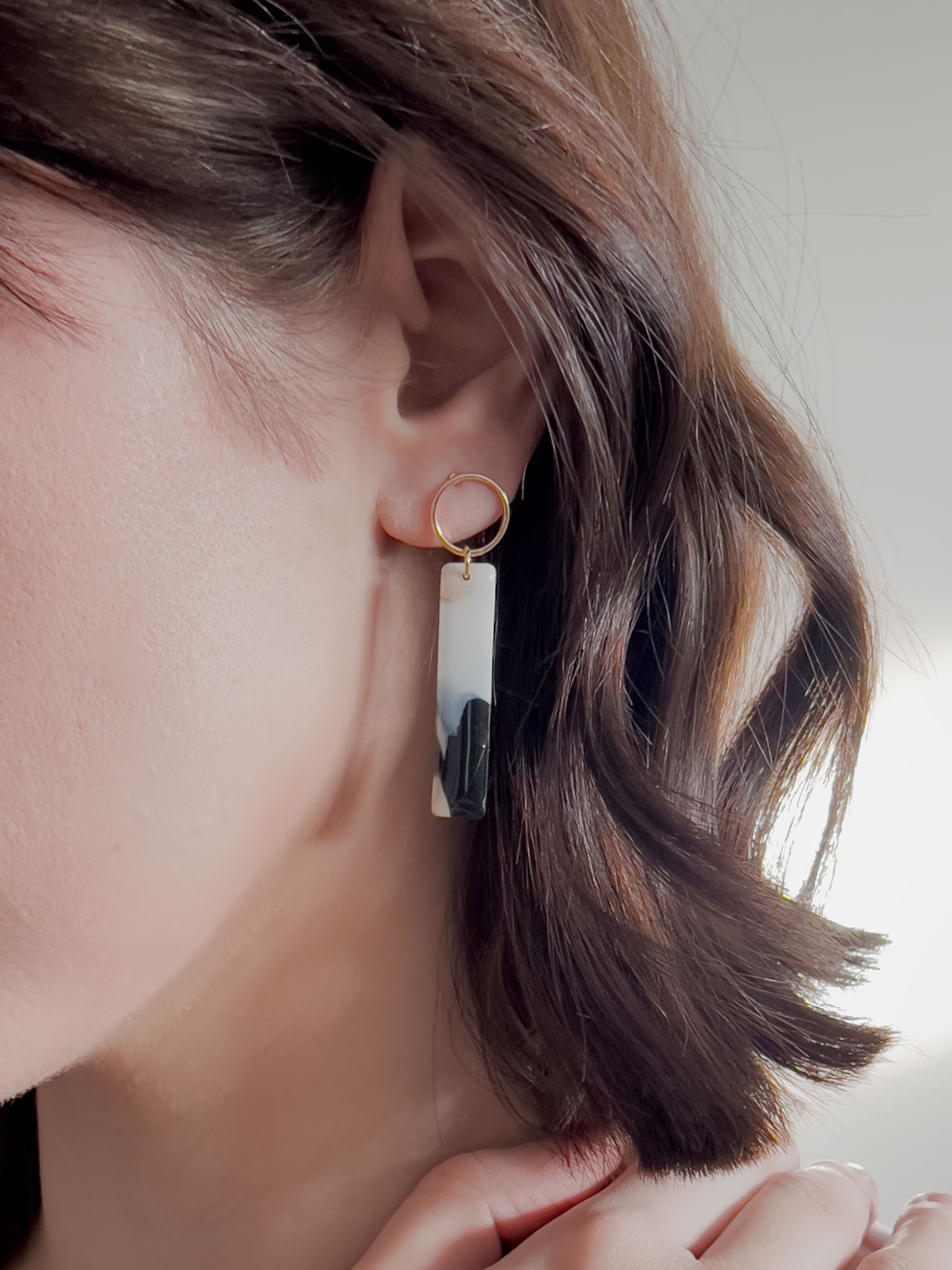 ALEA, "the noble one" - a really fitting name for our new styles with modern white-cream-black marbling. The elongated earring shape fits wonderfully to the face, the round circle stud gives the whole thing that certain something. ✨