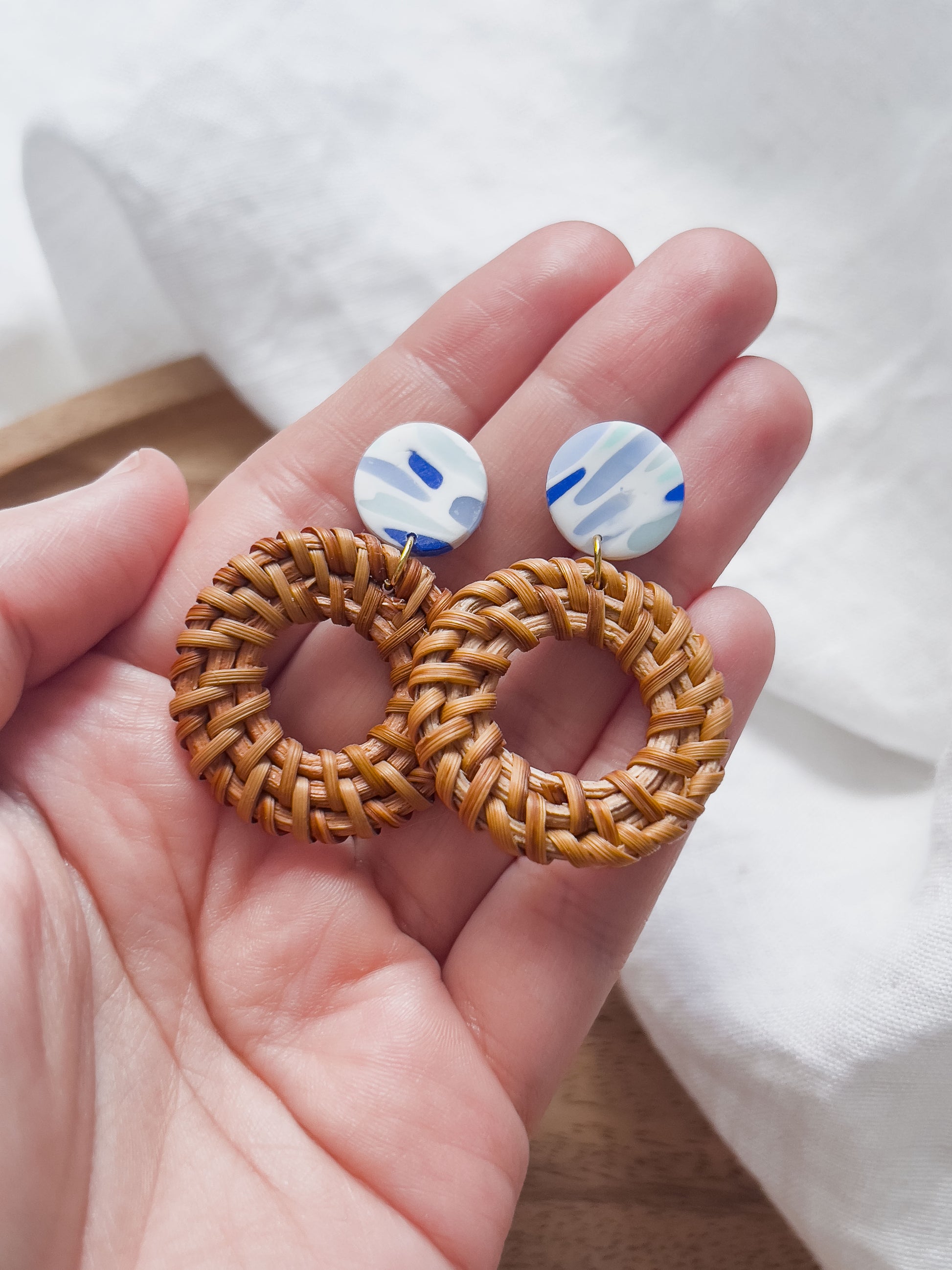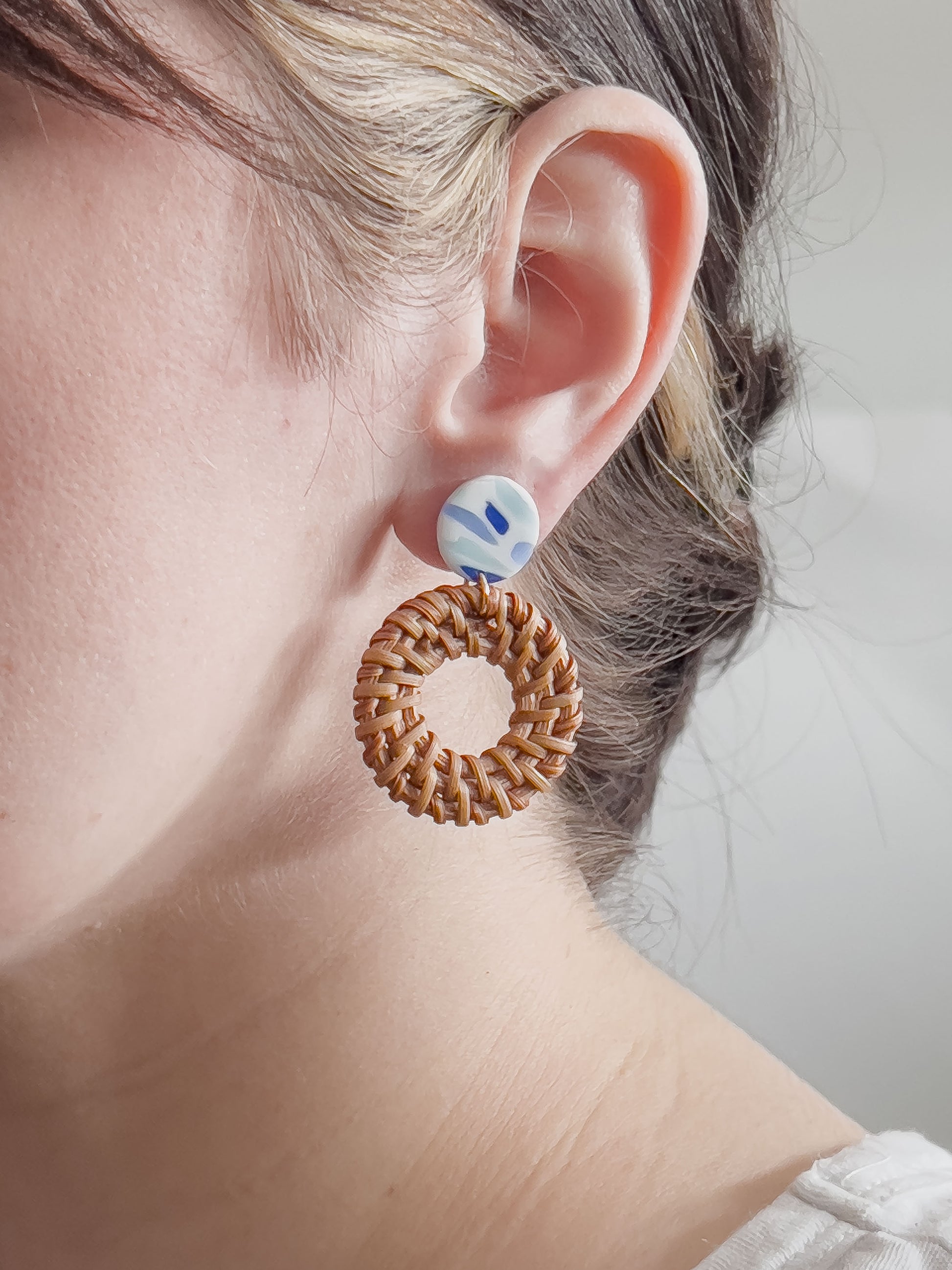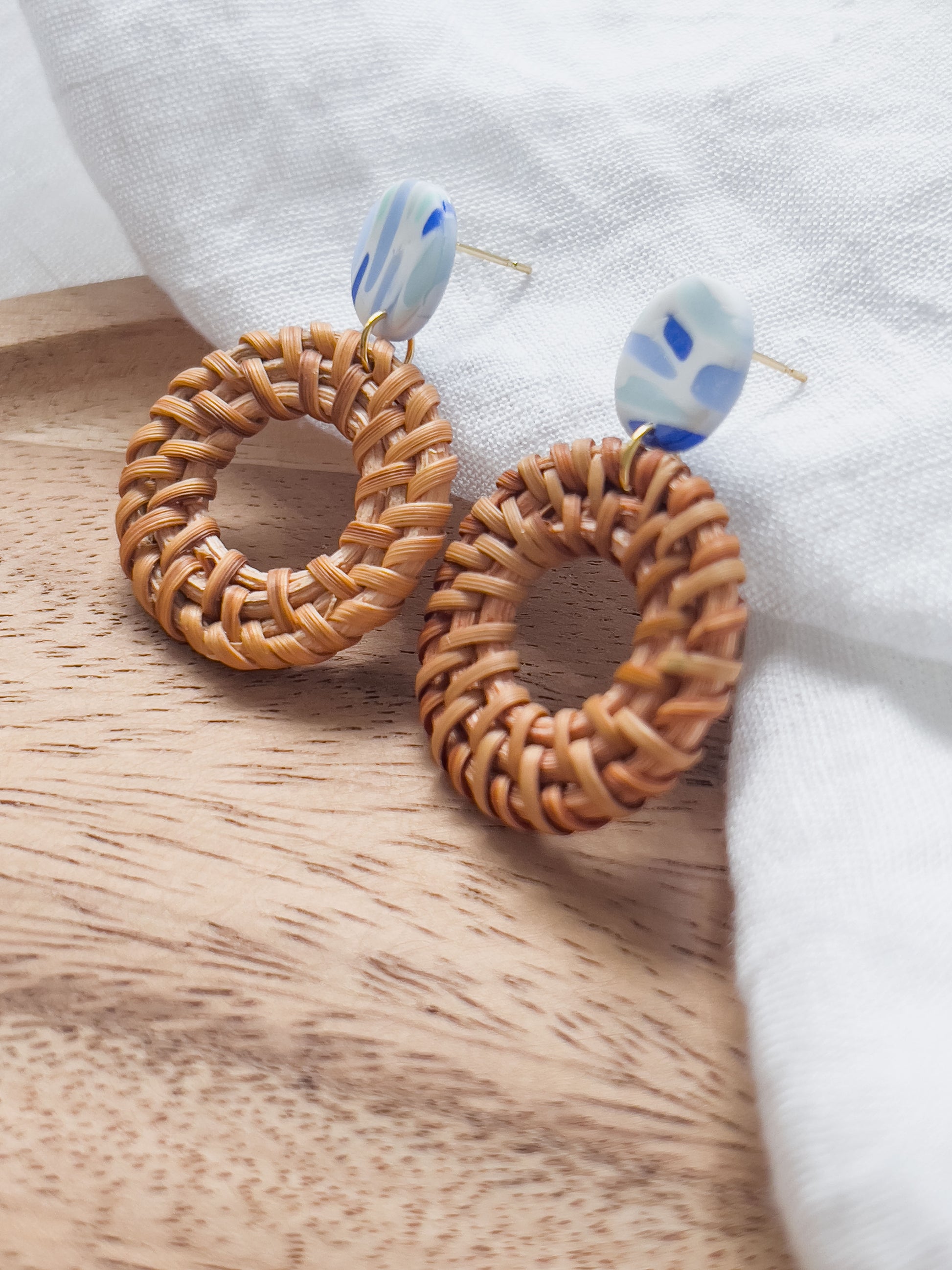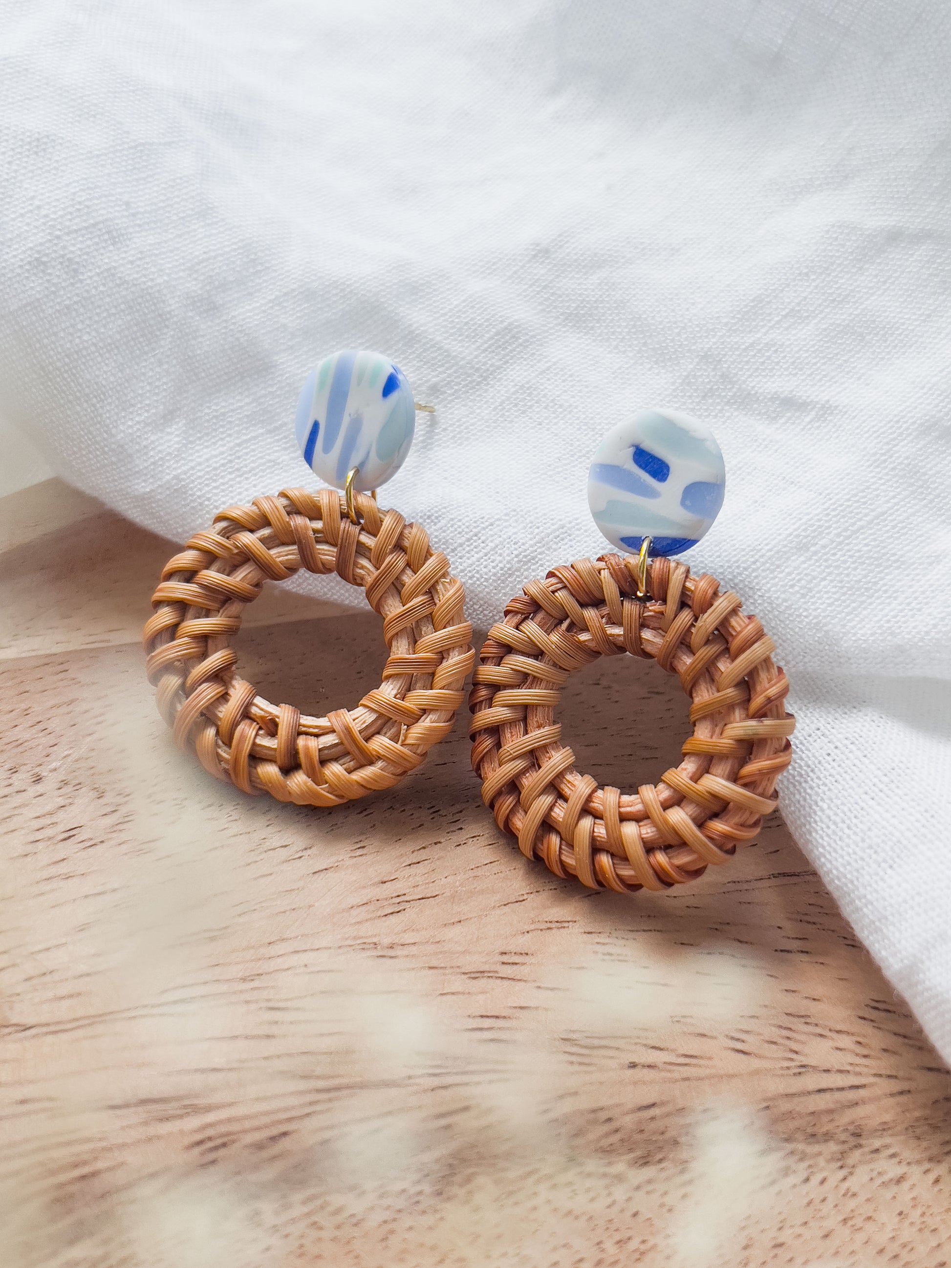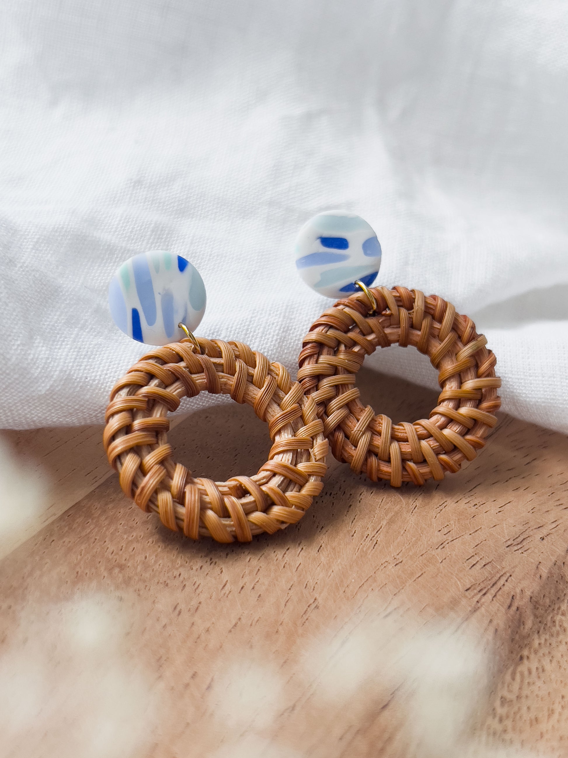 So wie das Meer in allen blauen Farben in der Sonne glänzt, so einzigartig sind diese blauen Rattan Ohrringe. Das handgefertigte Muster aus halb- & transparentem Polymer Ton versprüht richtiges Strand-Feeling ☀️