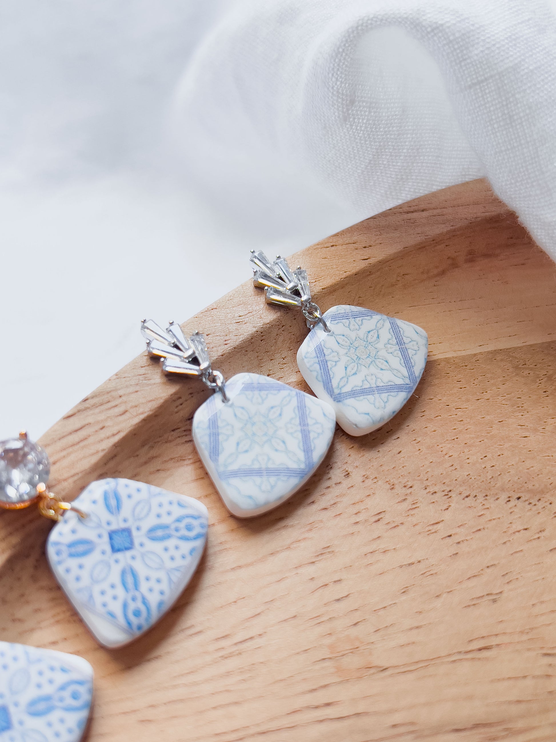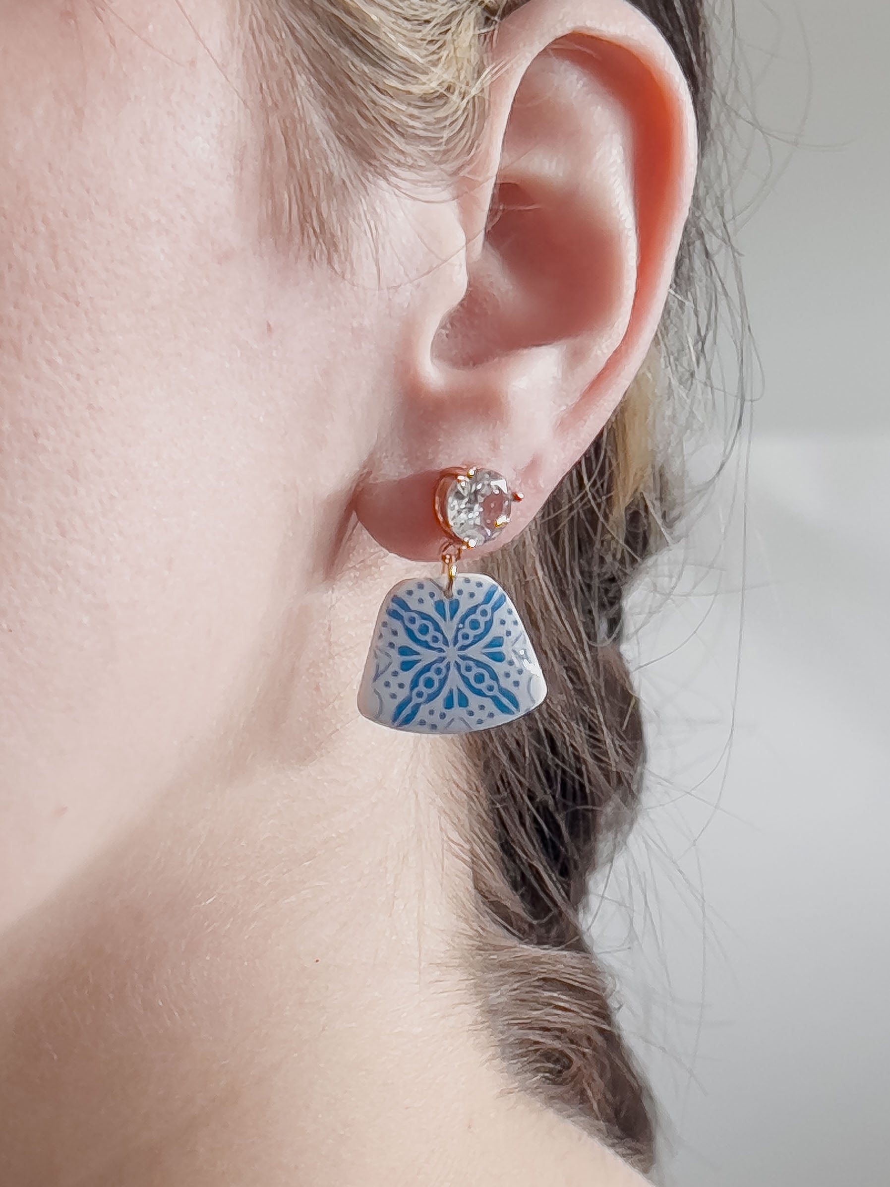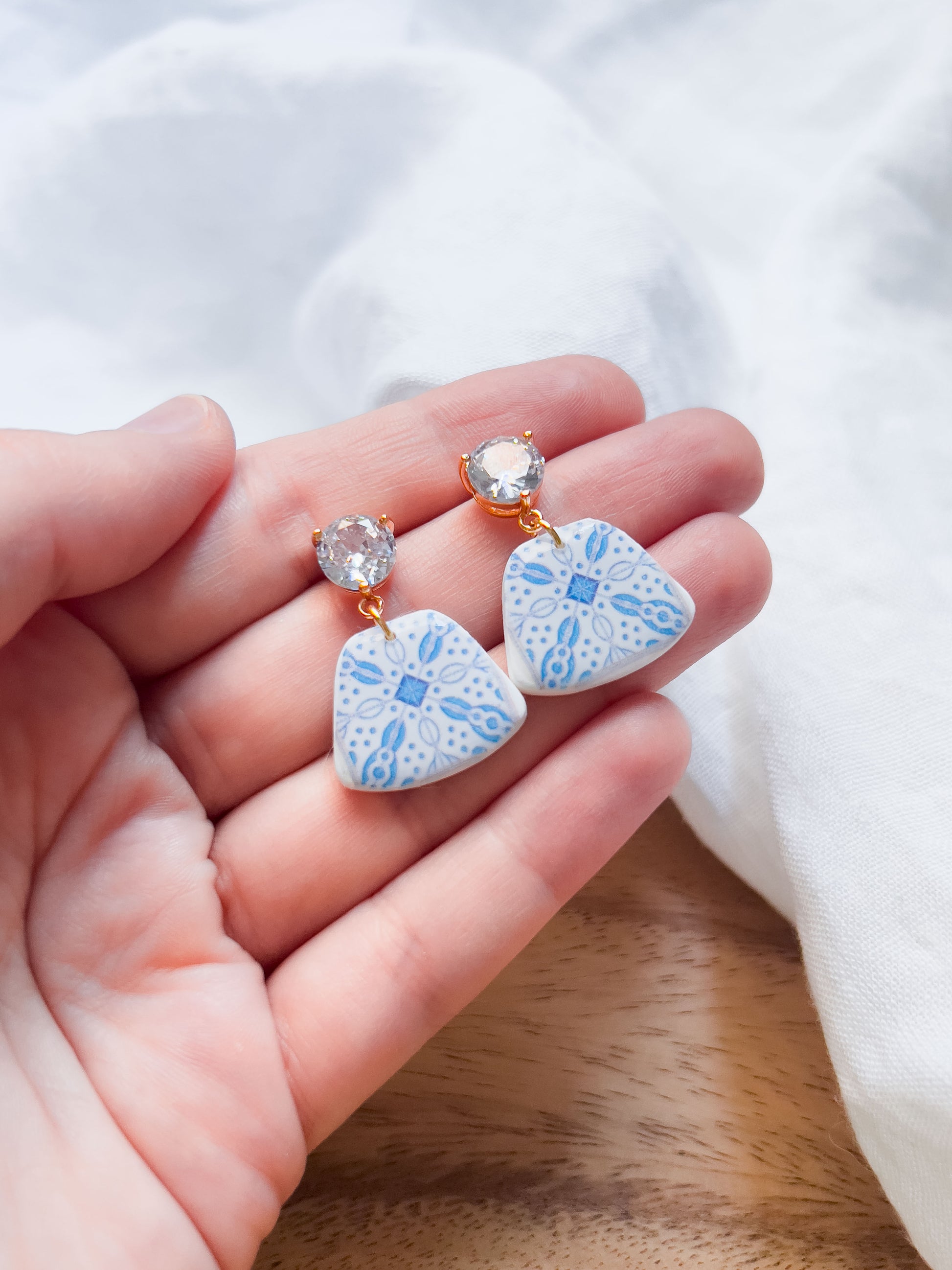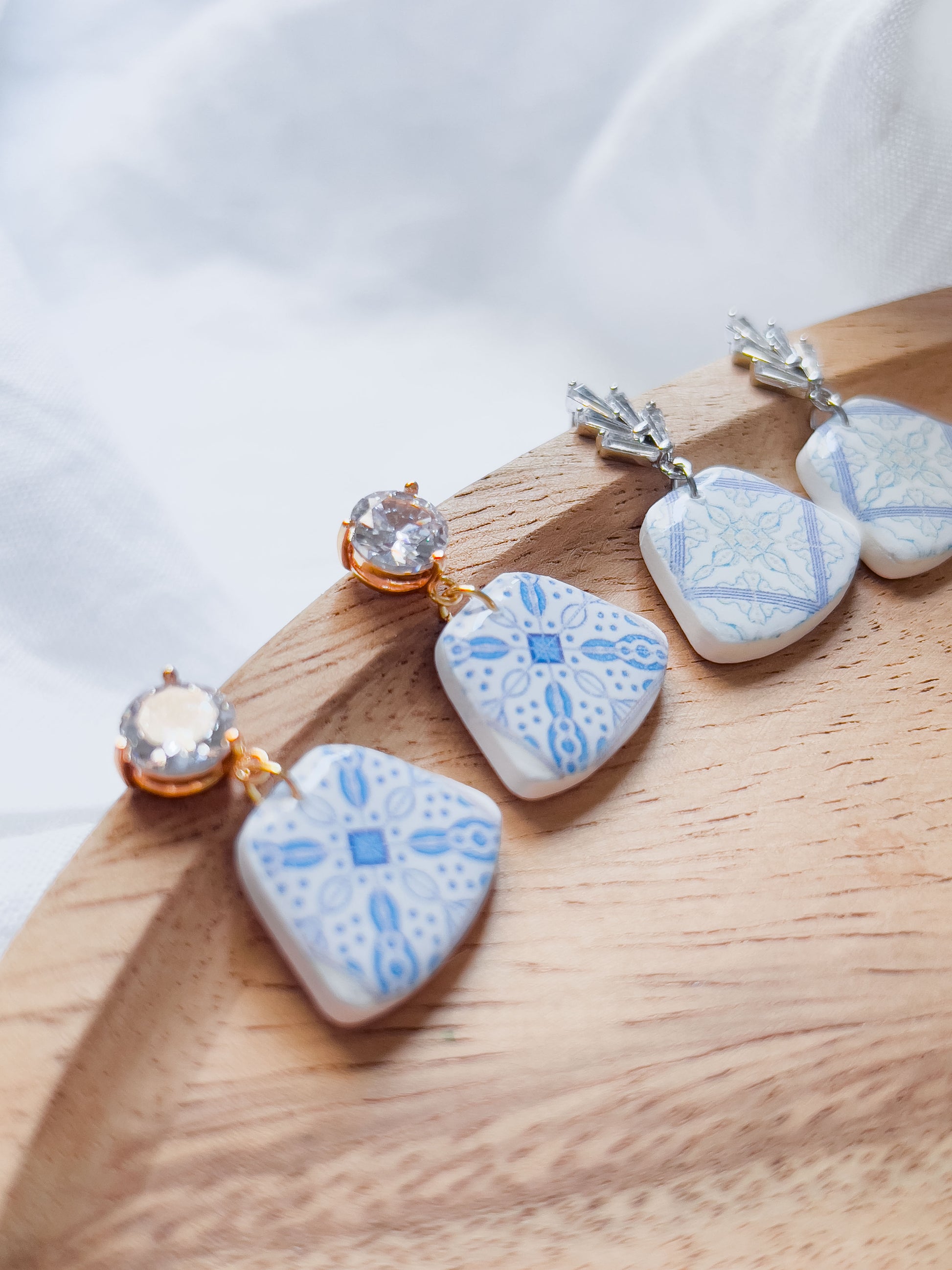 Durch das einzigartige Fliesen-Muster in Weiß- und Blautönen bekommen diese eleganten Ohrringe mit goldenem Kristallglasstecker oder silberfarbenen Zirkonia-Stecker richtig schöne Griechenland-Vibes 🌊 Erster Gedanke: Sommer, Sonne, Strand, Meer, gutes Essen und eine tolle Zeit.