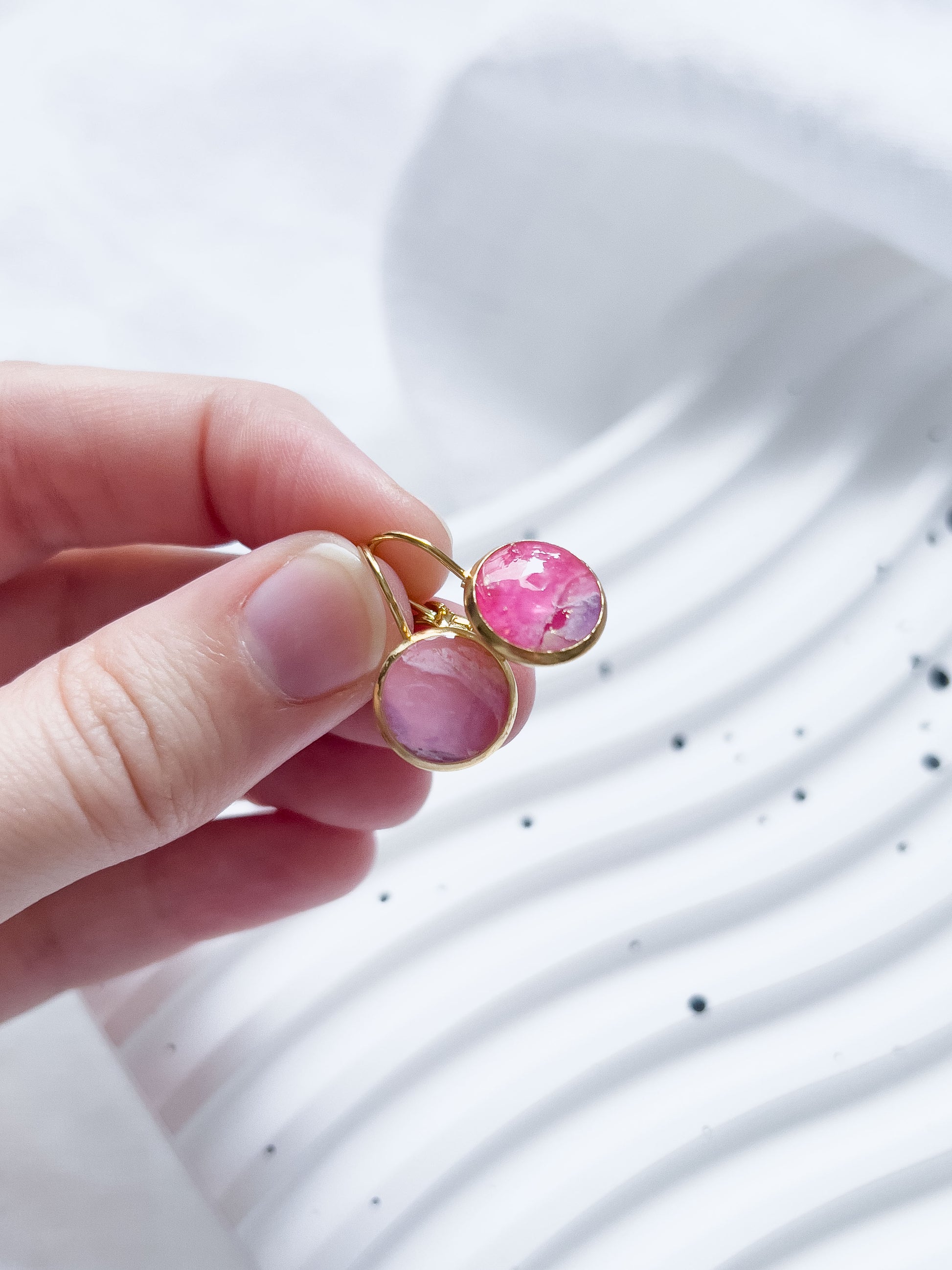 Unsere fuchsia-farbene und einzigartig marmorierte Mini-Kollektion entstand in Erinnerung an meine 2025 verstorbene Oma. Vor zwei Jahren habe ich eine Anfertigung in ihren Lieblingsfarben Rosa und Lila für sie gemacht, und diese Ohrringe wurden gemeinsam mit ihr auf die Reise geschickt. Um sie gebührend zu verabschieden, habe ich meiner Mum und mir ein paar Schmuckstücke designed, die an die ersten Ohrringe erinnern. So können wir sie immer bei uns tragen 💜🩷🤍