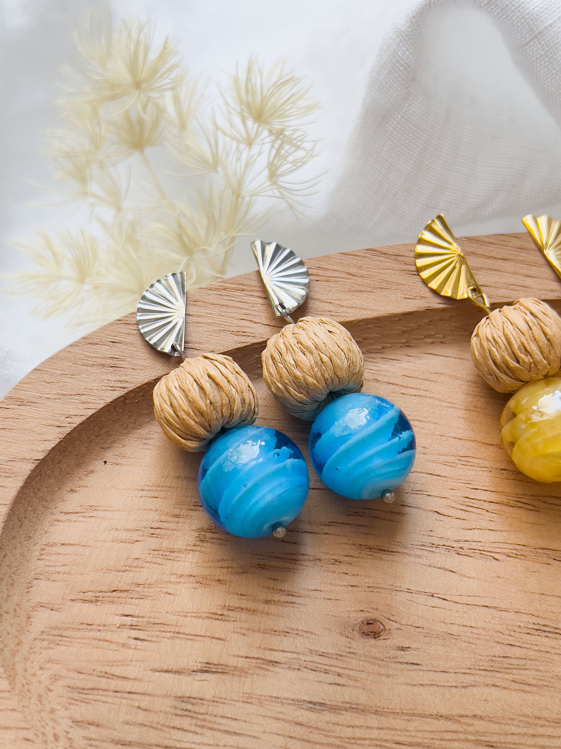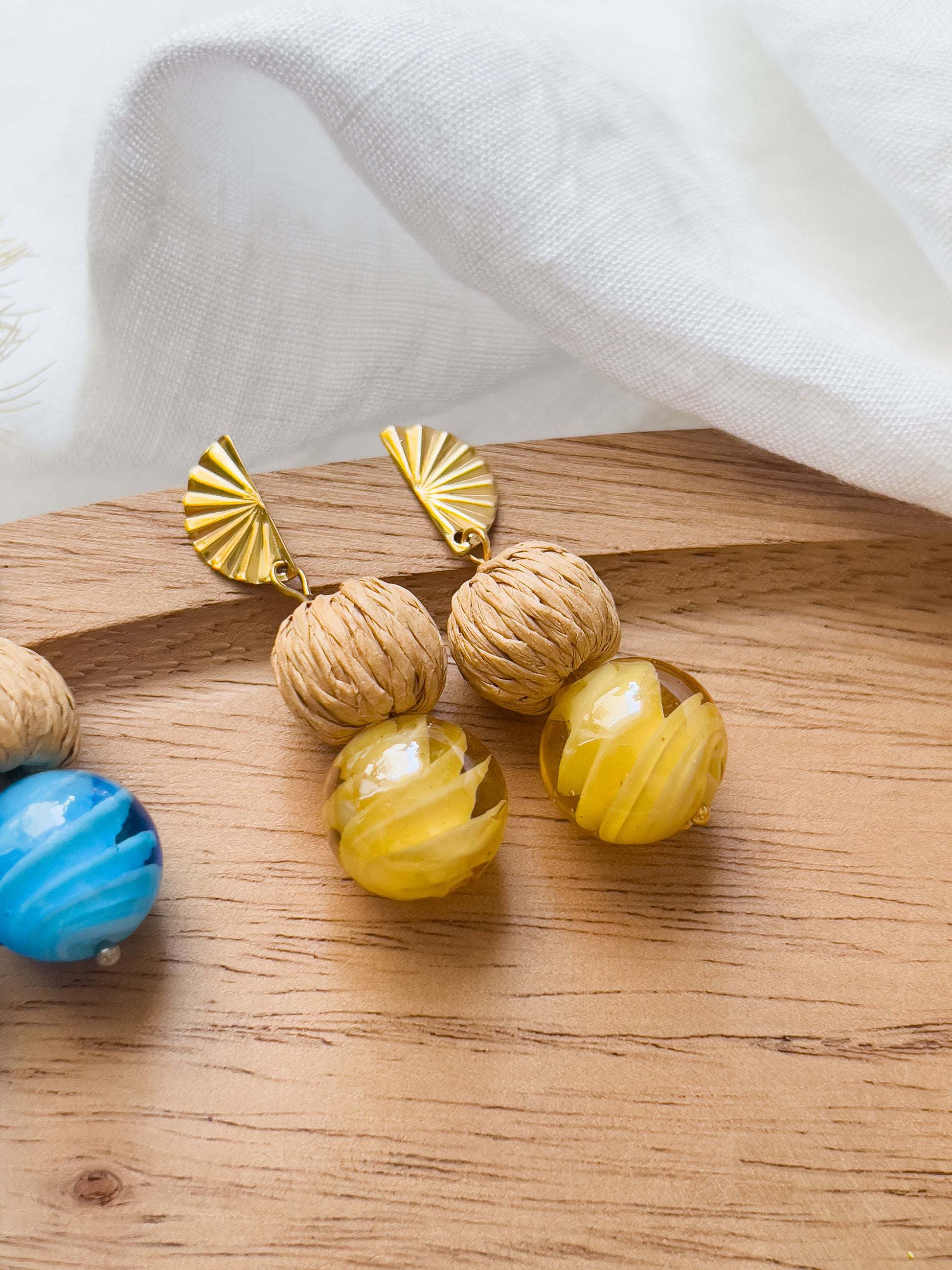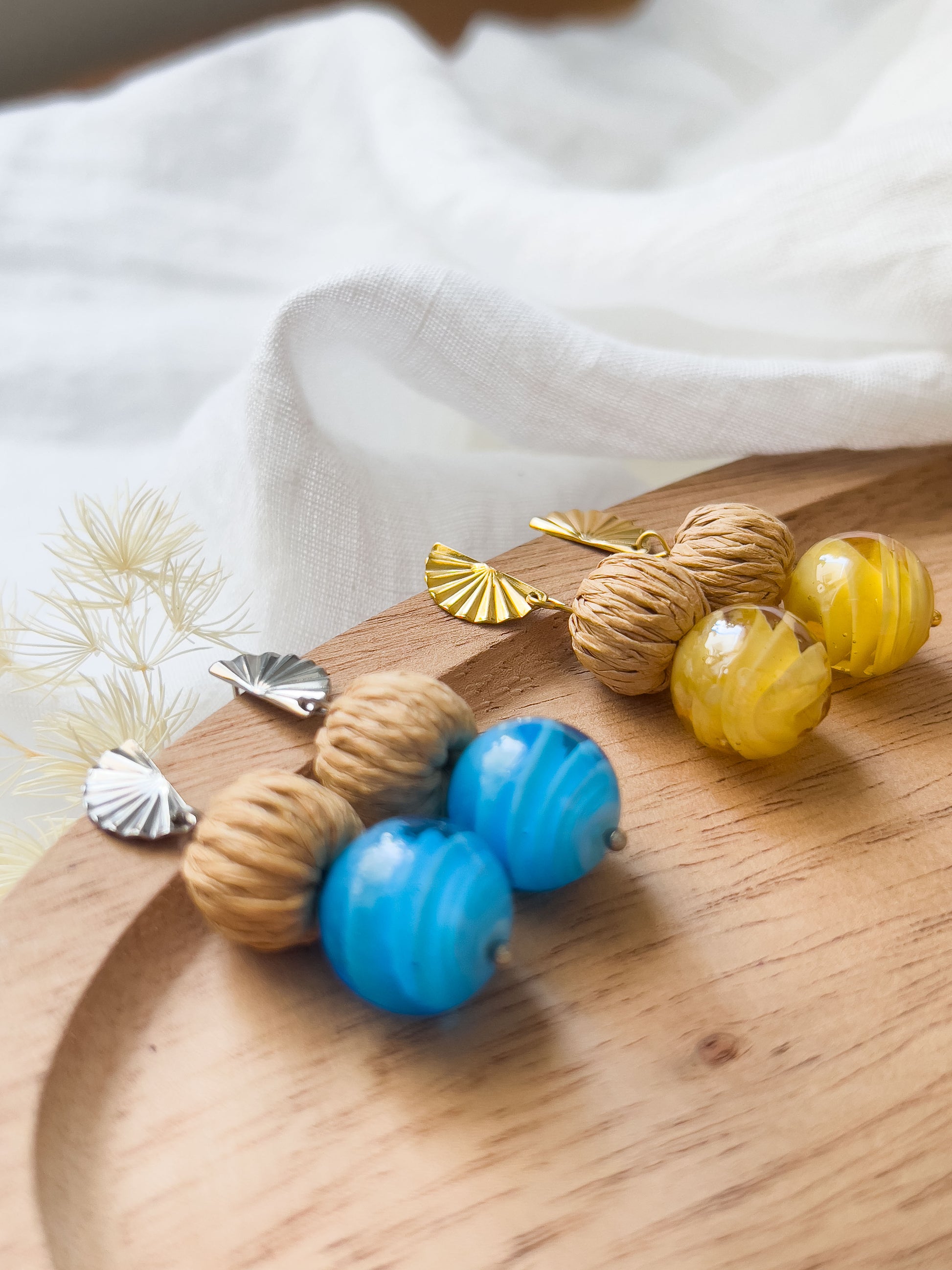 Wir haben früher mit Murmeln gespielt, du auch? Als wir diese coolen Glasperlen gefunden haben, mussten wir etwas Schönes für dich daraus machen! Et voilà: Einzigartige Glasperlen-Ohrringe in sommerlichen Gelb- und Blautönen, kombiniert mit einer kleinen handgewobenen Rattan-Kugel 🌊