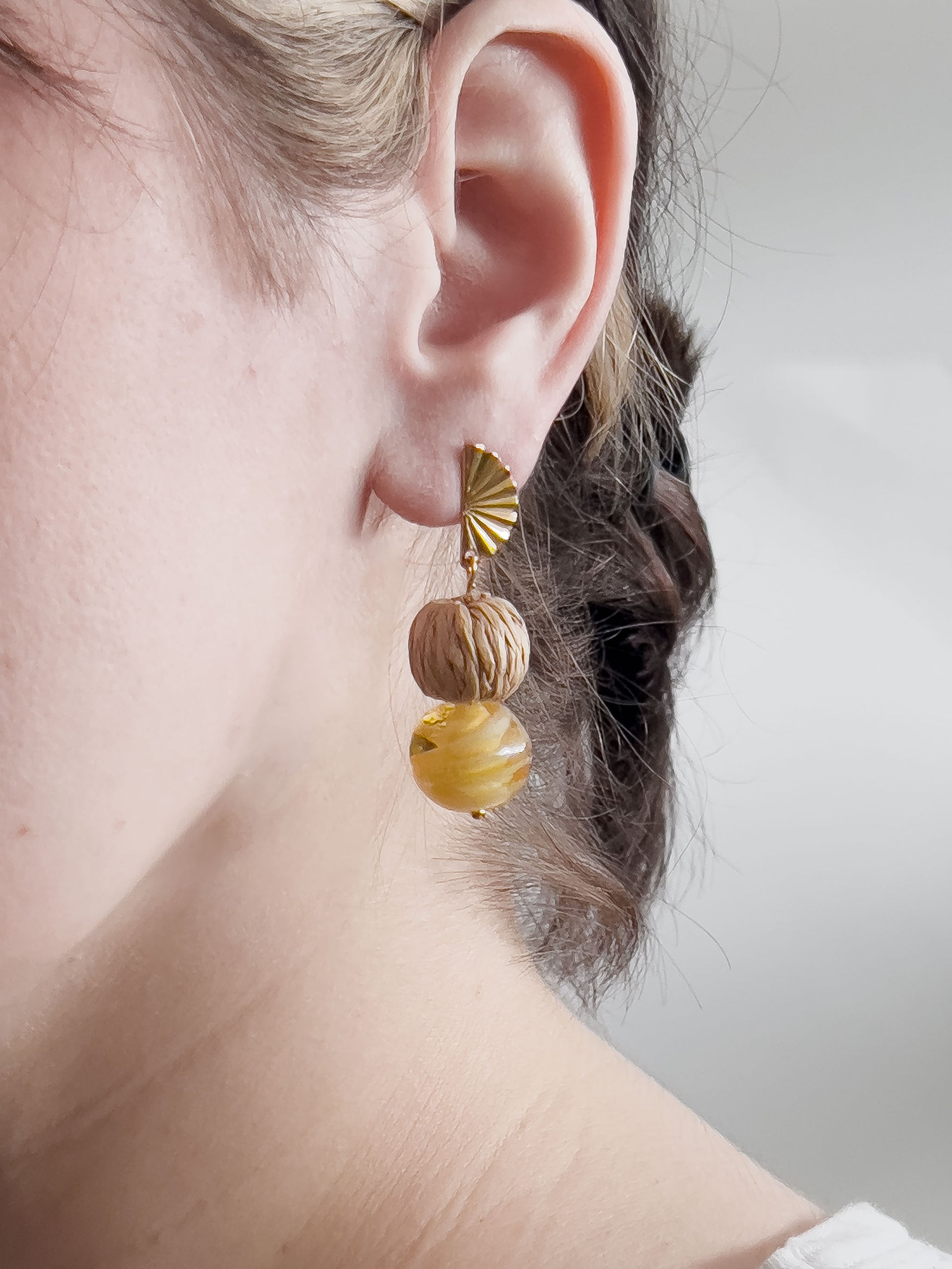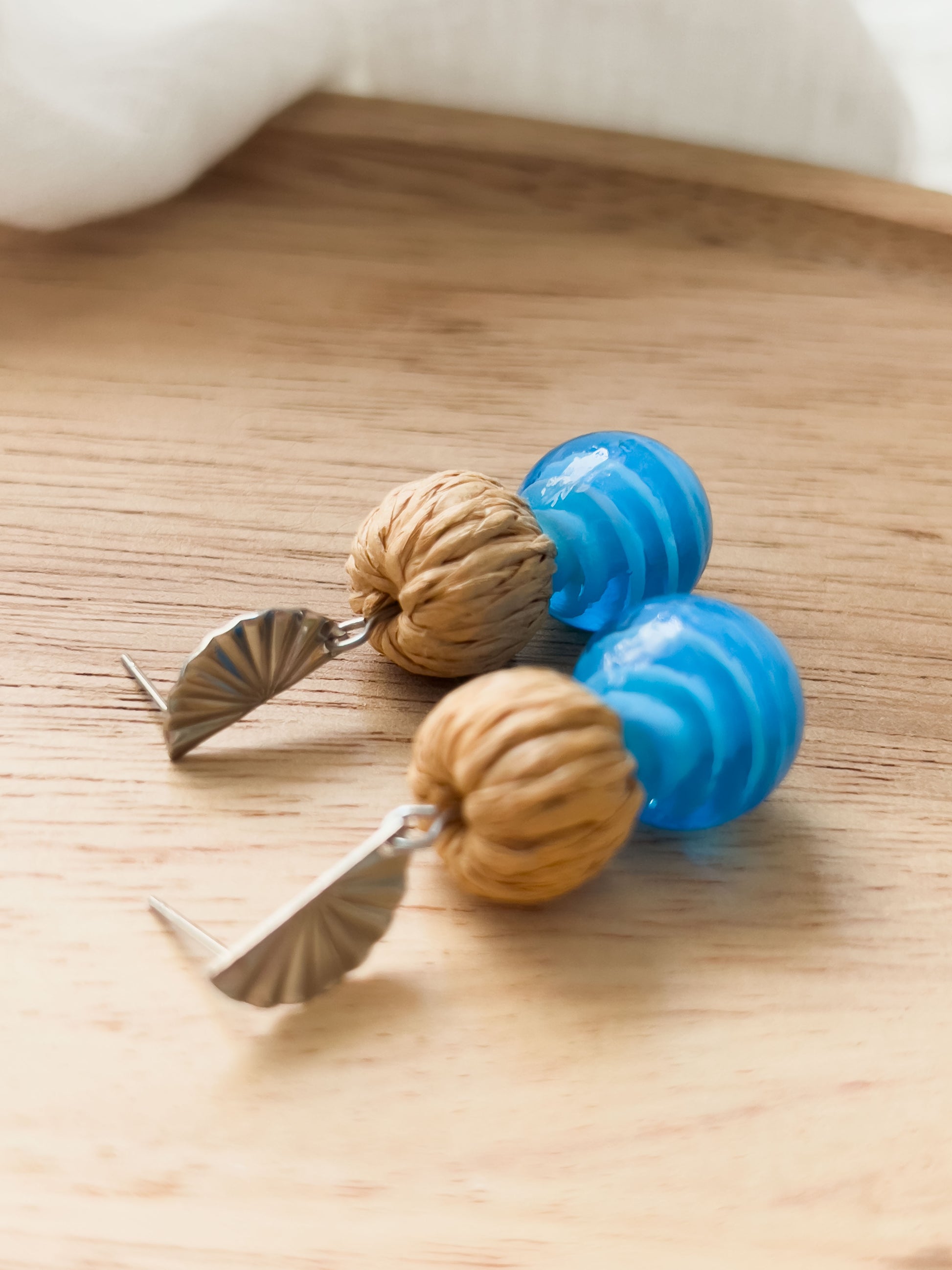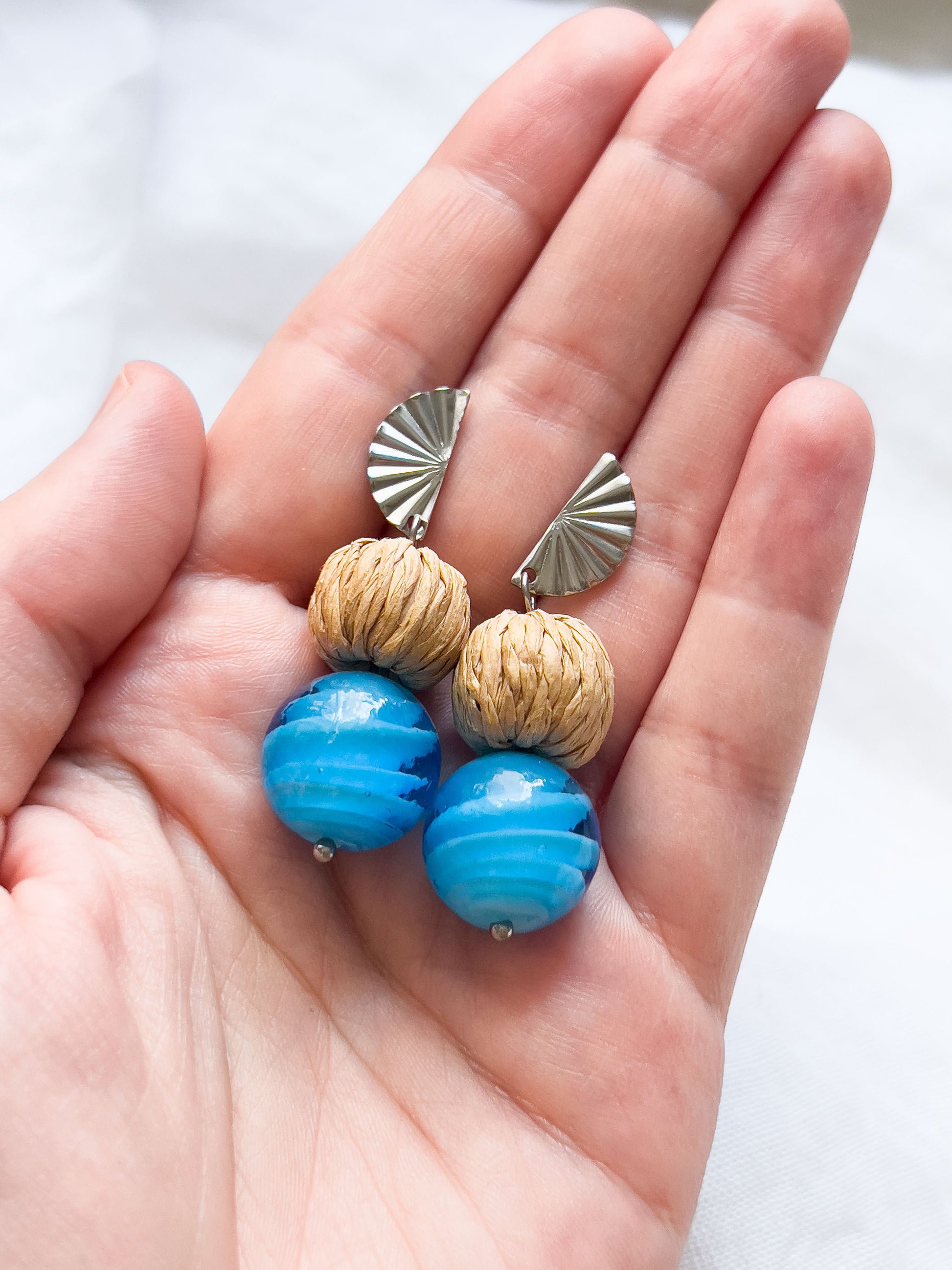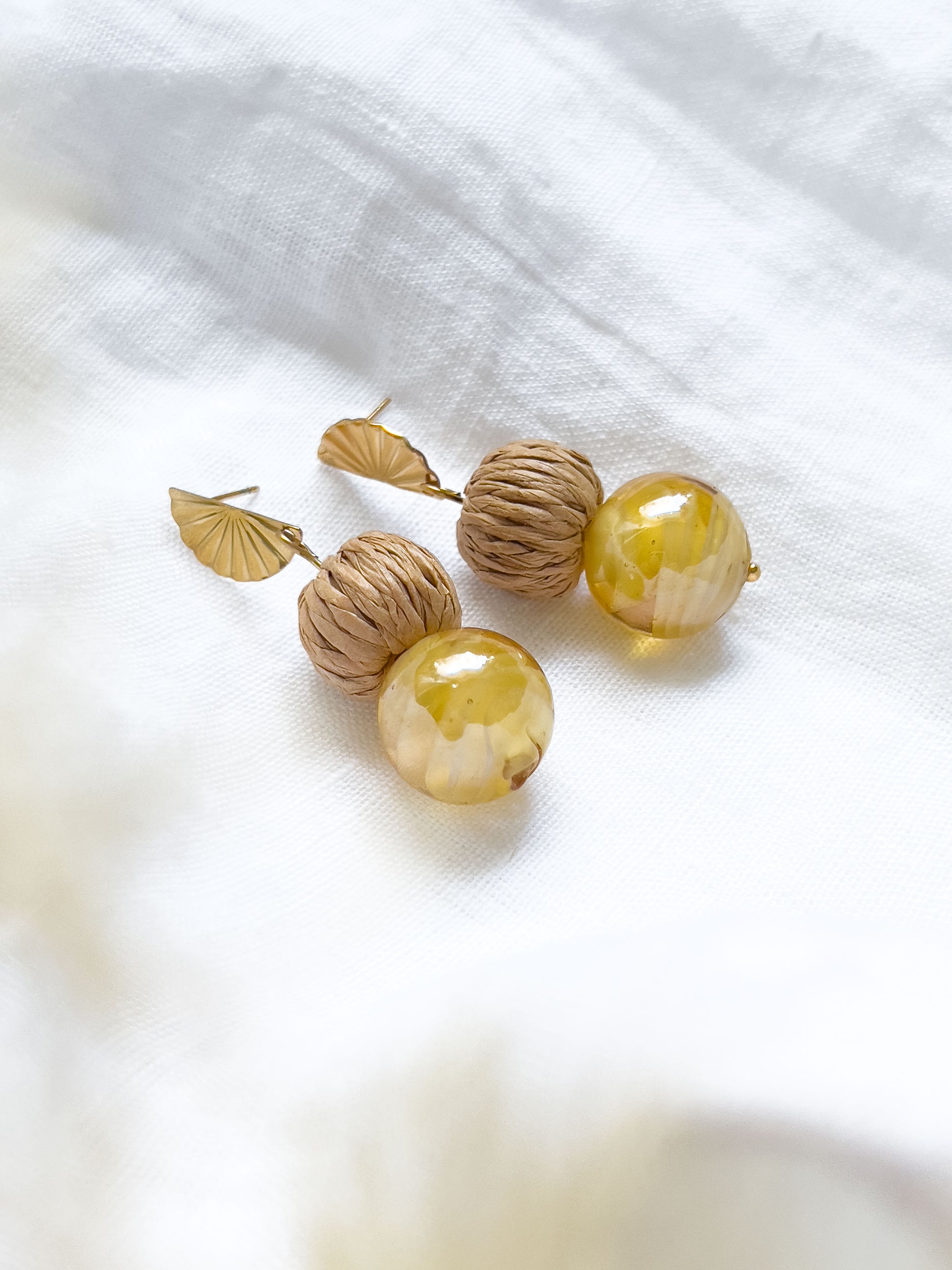 Wir haben früher mit Murmeln gespielt, du auch? Als wir diese coolen Glasperlen gefunden haben, mussten wir etwas Schönes für dich daraus machen! Et voilà: Einzigartige Glasperlen-Ohrringe in sommerlichen Gelb- und Blautönen, kombiniert mit einer kleinen handgewobenen Rattan-Kugel 🌊