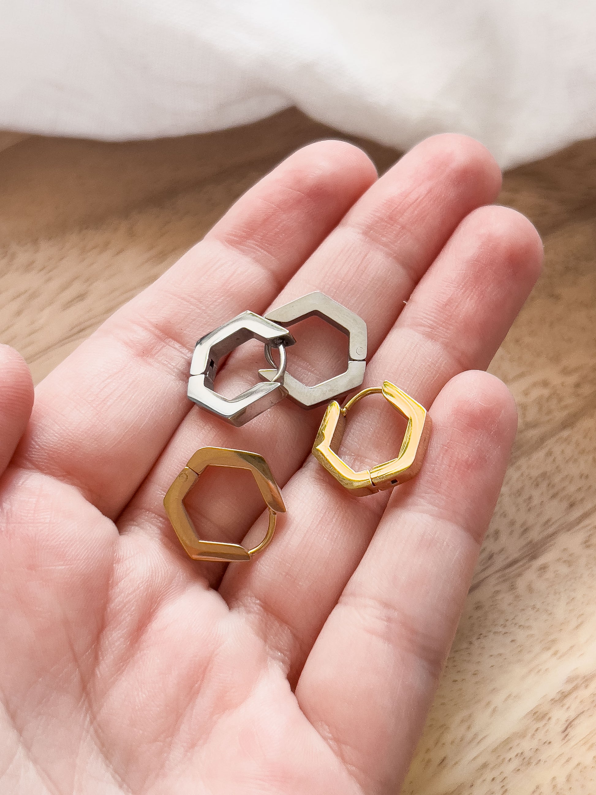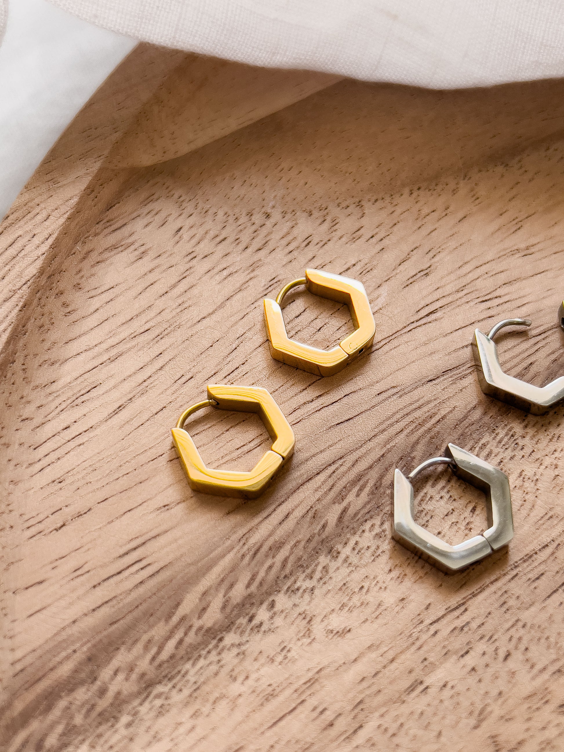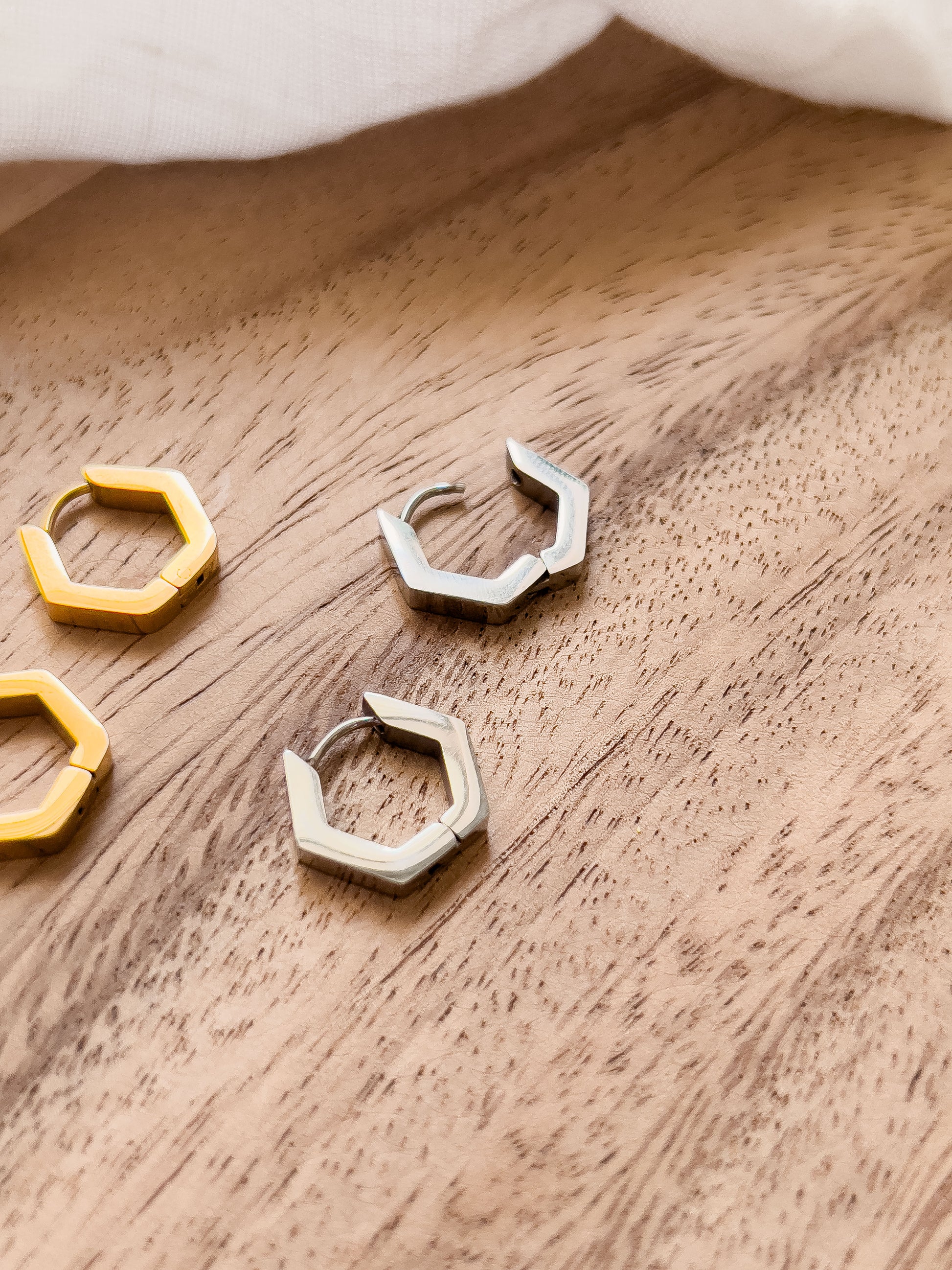 Hello, little HEXAs 👋🏻 These cute huggie earrings are perfect for those who prefer something a little more subtle but still want something unique. They nestle gently against the ear and their flat hexagonal shape is super modern. A real it-piece!