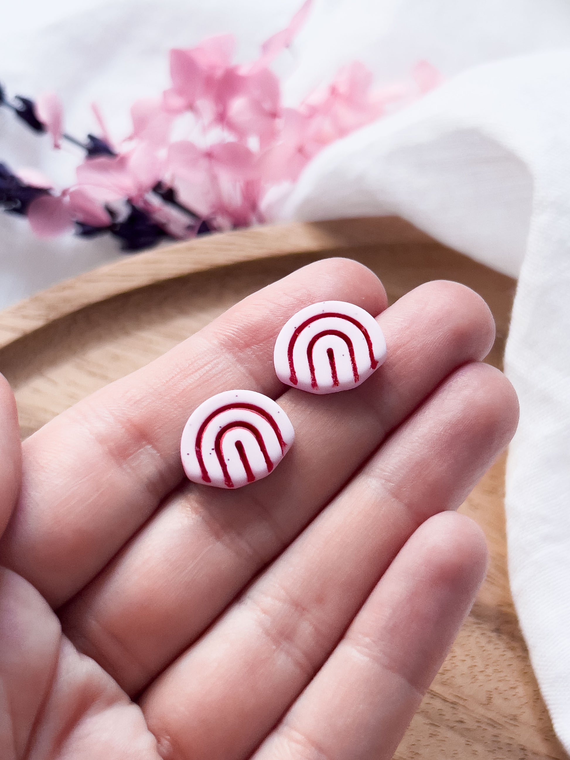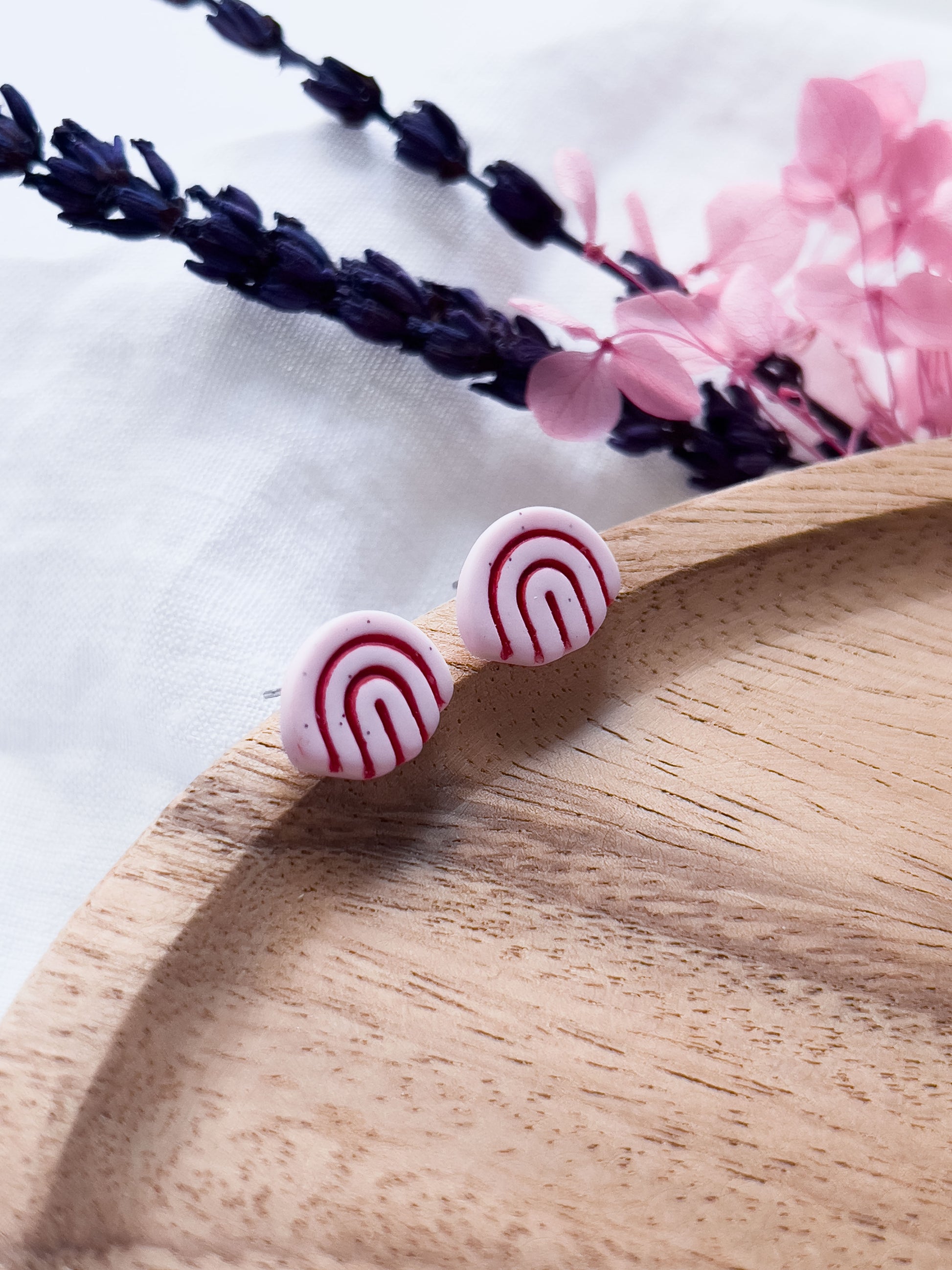 Diese kleinen Regenbogen-förmigen pinken Ohrstecker wurden von Hand mit roter Farbe "verfugt". Die Trendkombi pink-rot kommt so toll zur Geltung, auch wenn sich die kleinen Ohrstecker insgesamt dezent halten 🌸
