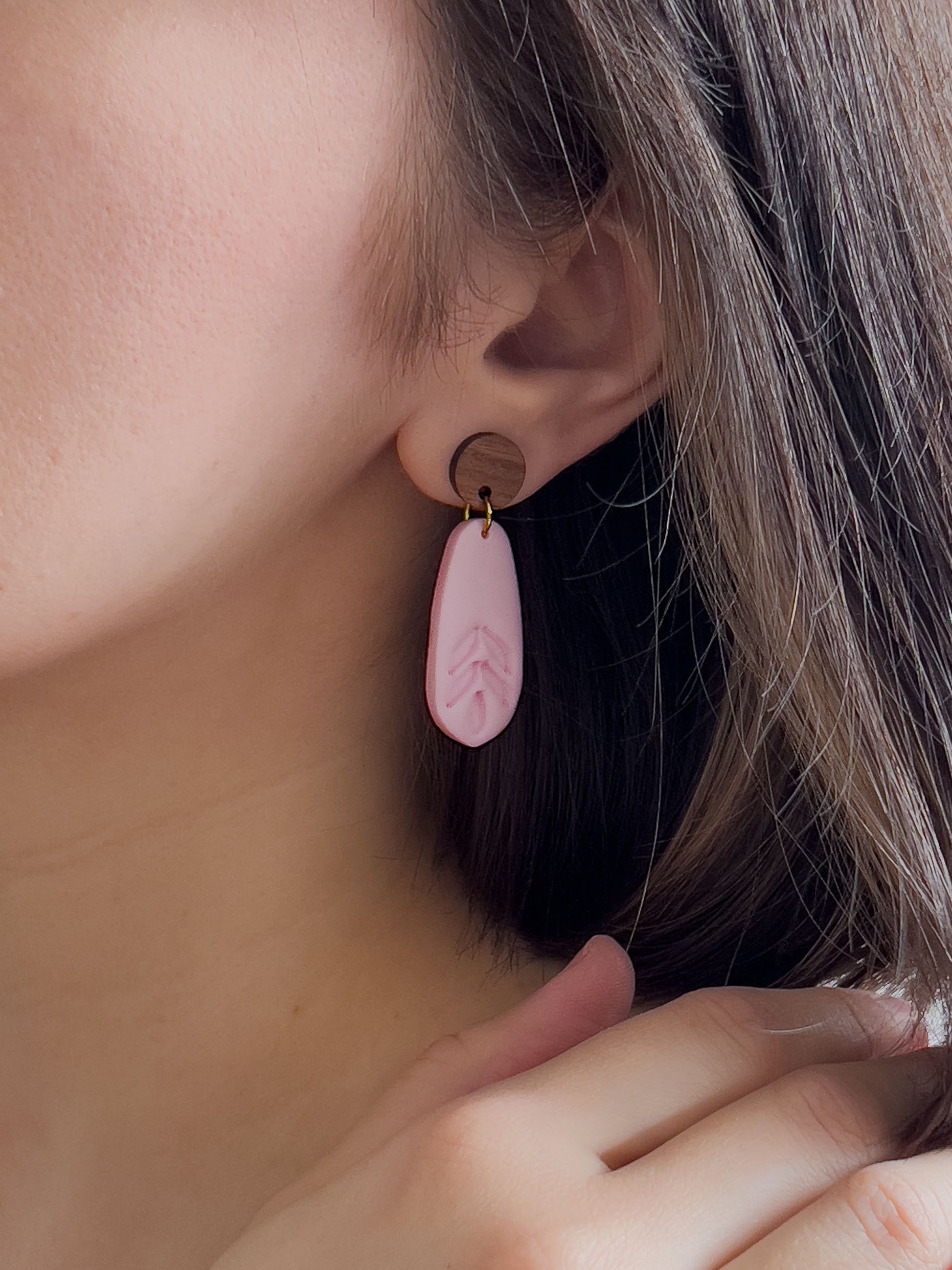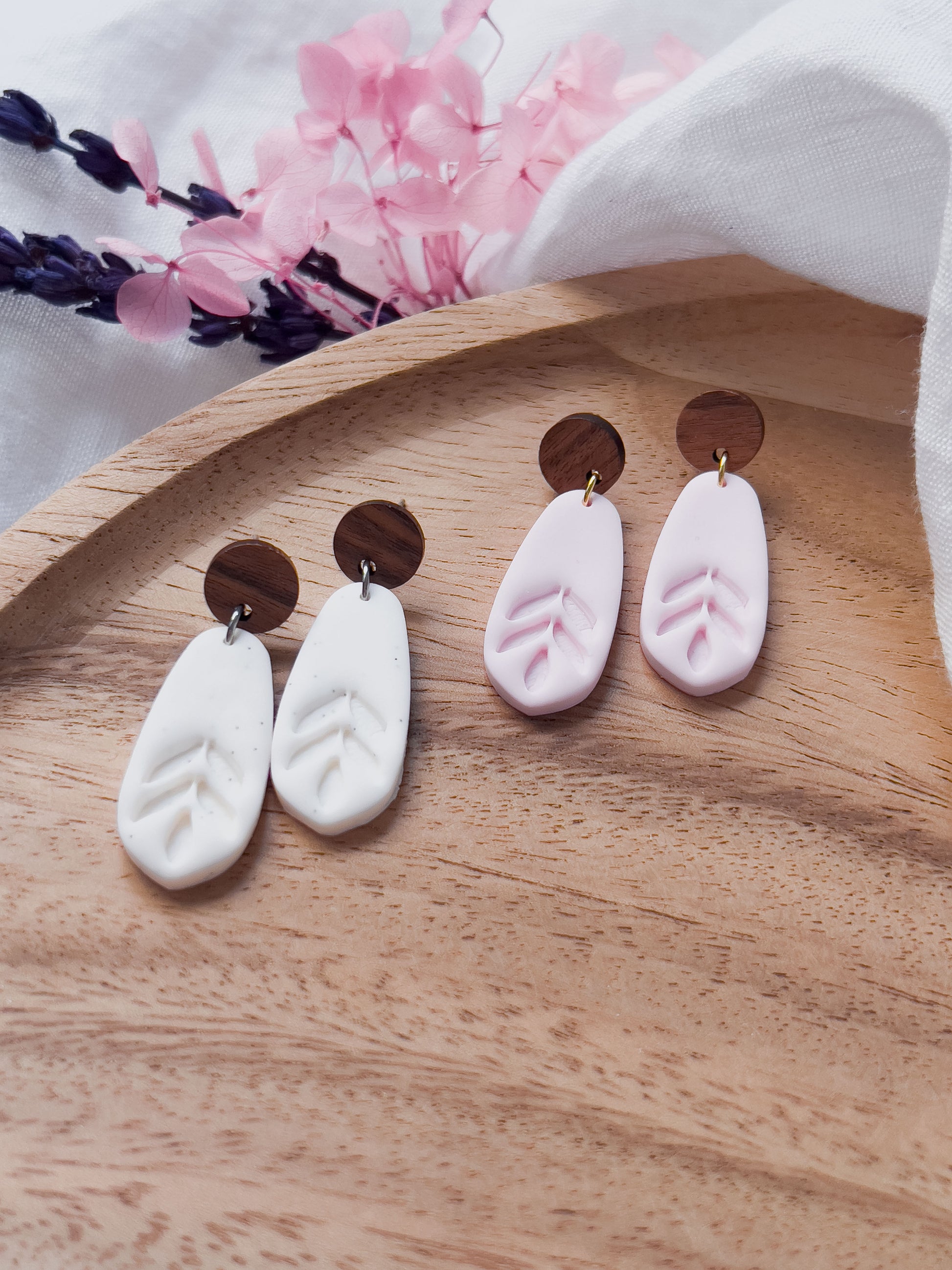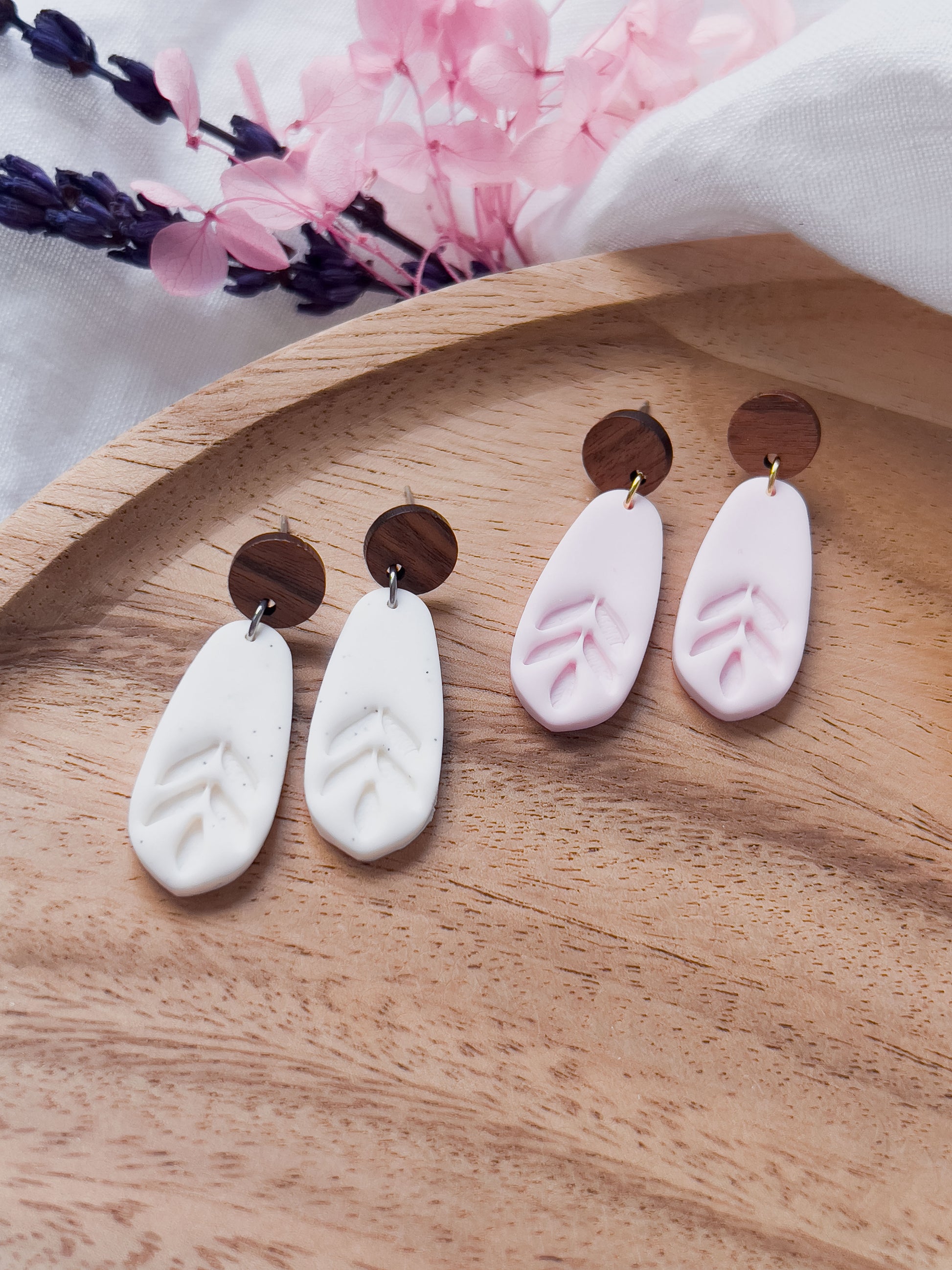 Die Kombination von Holz und Polymer Ton ist eine, die uns besonders gut gefällt. Daher dürfen auch in der Frühlingskollektion diese filigranen langen Ohrringe mit Blumen-Imprint nicht fehlen 🌸
