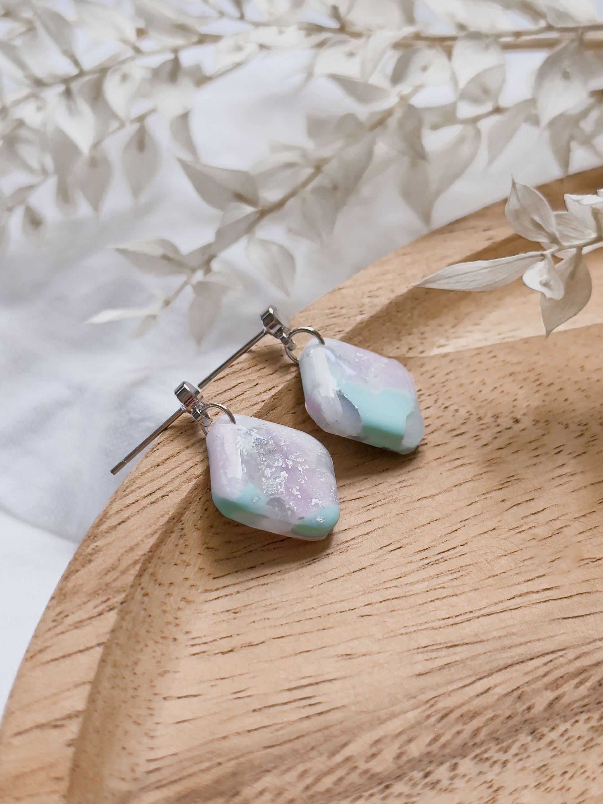 Lila-türkis marmoriert – eine super schöne und einzigartige Farbkombi, wie wir finden 💜 Mit Silber-Blattmetall und halbtransparenten Polymer Ton veredelt sind diese Hübschen unbeschreiblich bezaubernde Schmuckstücke.