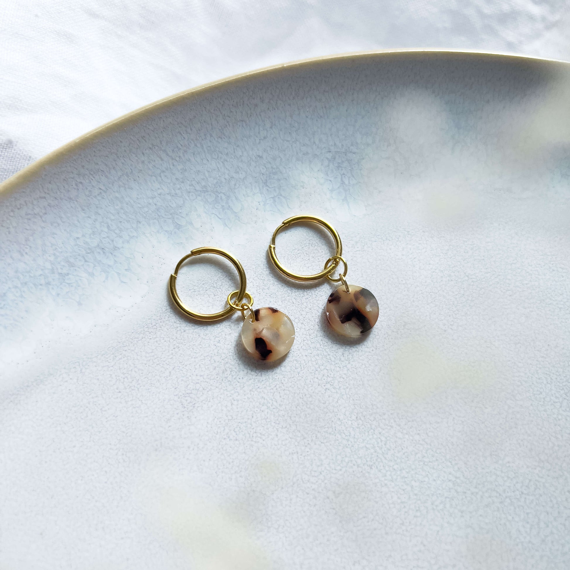 Feel beautiful every day! For example, with this set of gold hoop earrings and small brown tortoiseshell pendants. The earrings are subtle but also elegant and can be combined in many different ways using the mix & match system!