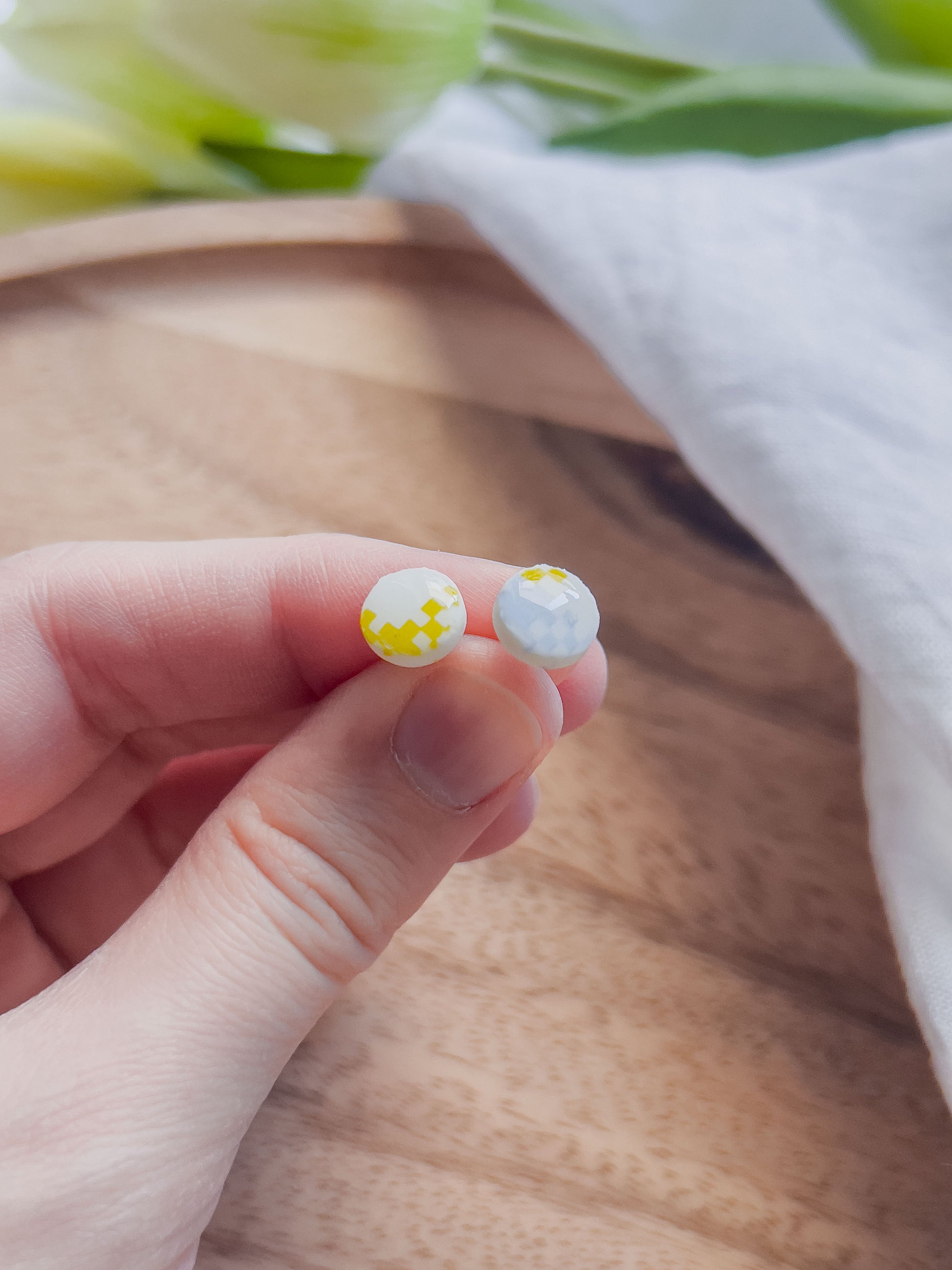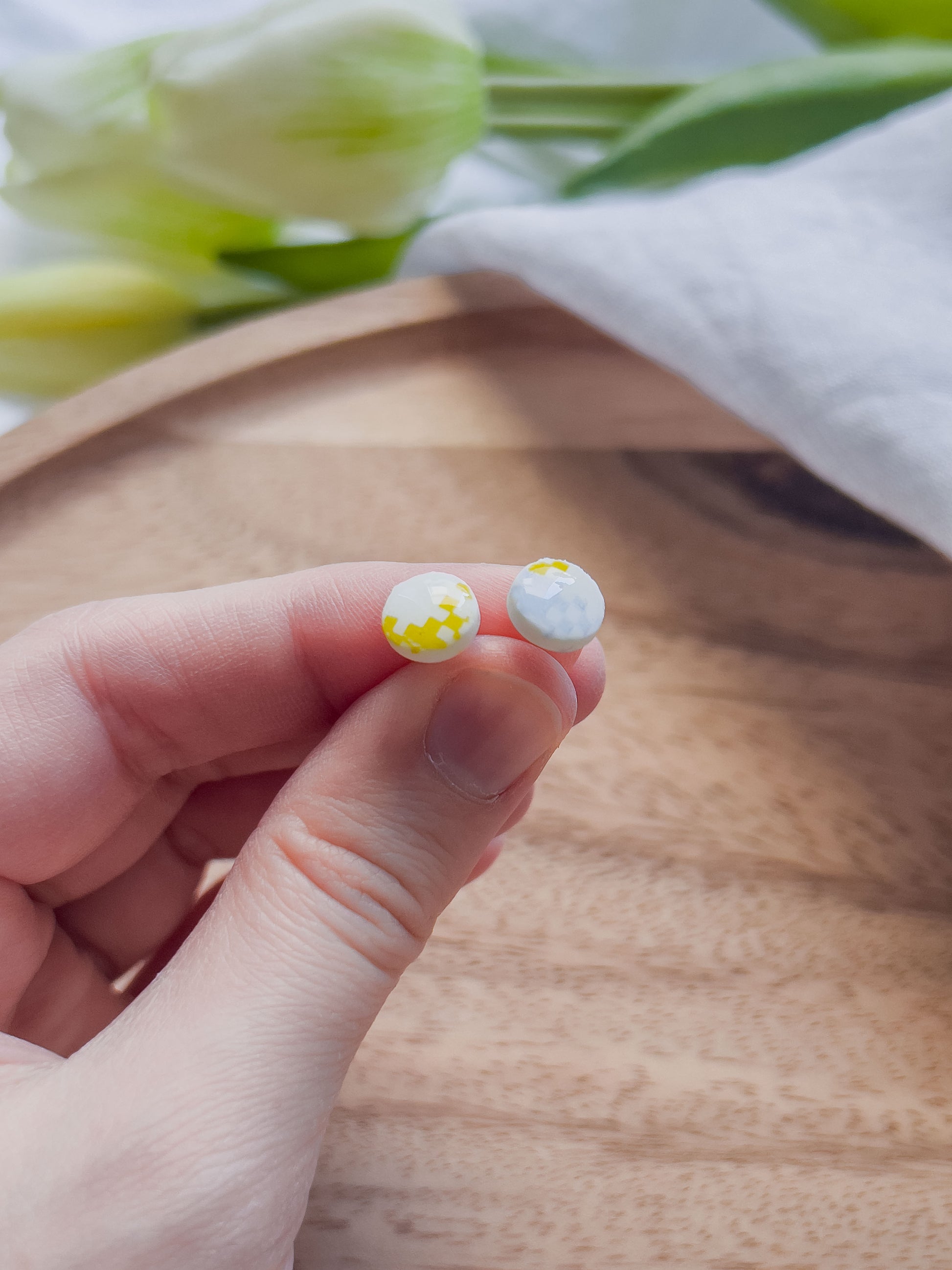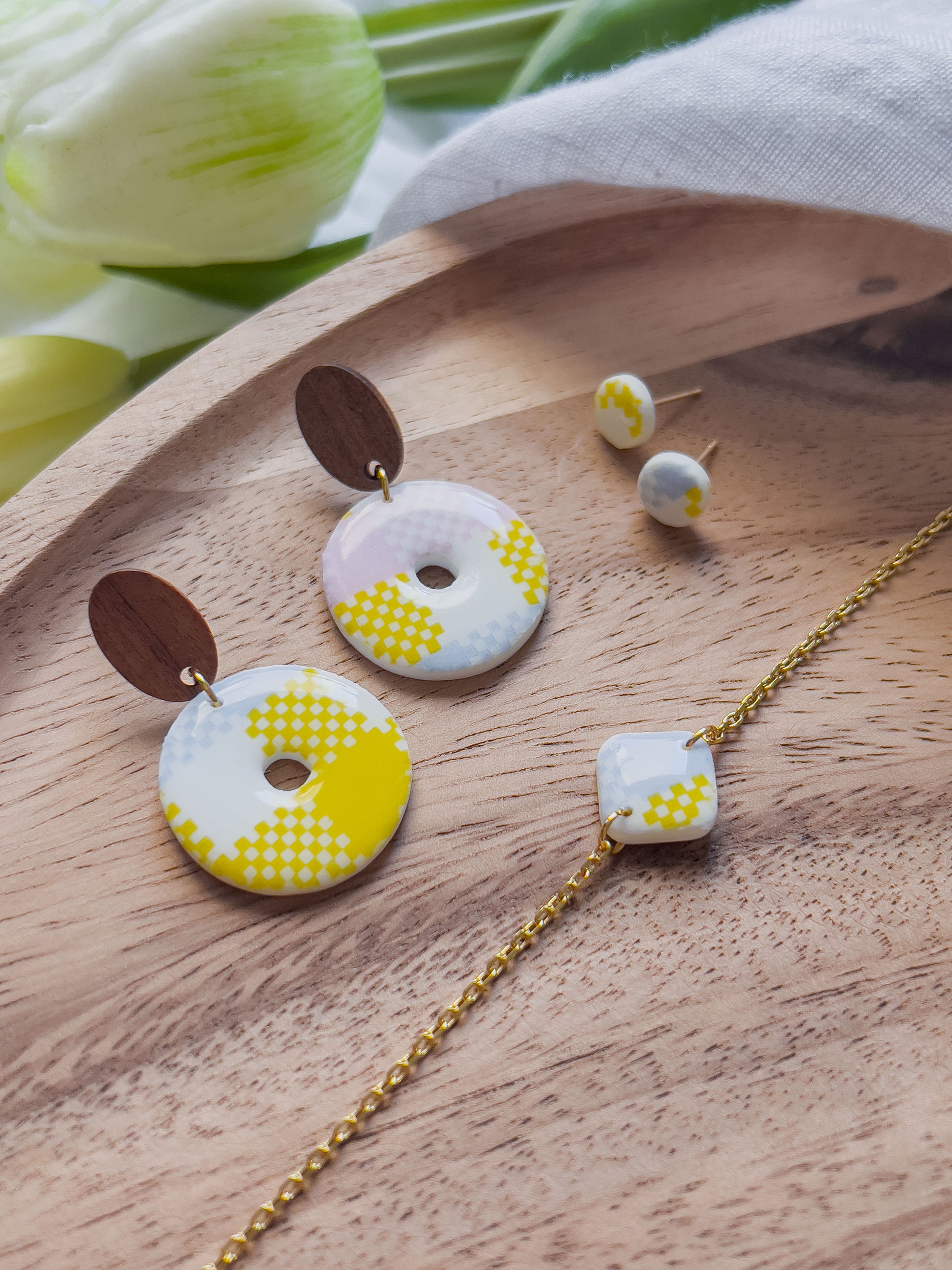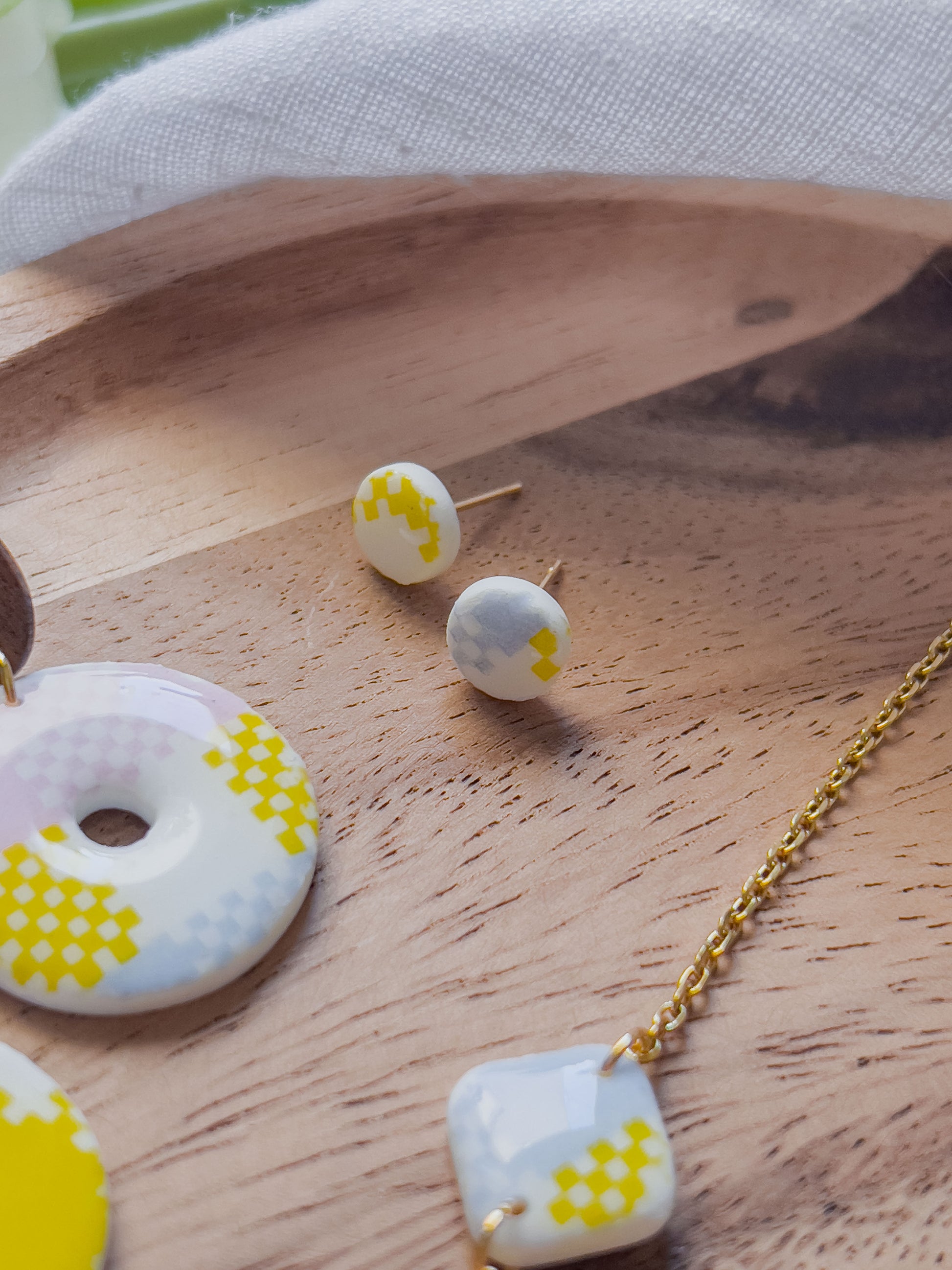 Von der Serviette zum Ohrstecker – tatsächlich wurden diese pastell-karierten Cuties von einem Serviettenmuster kreiert. Tolll für den Frühling: die pastelligen Gelb, Blau und Rosa Töne 🌼