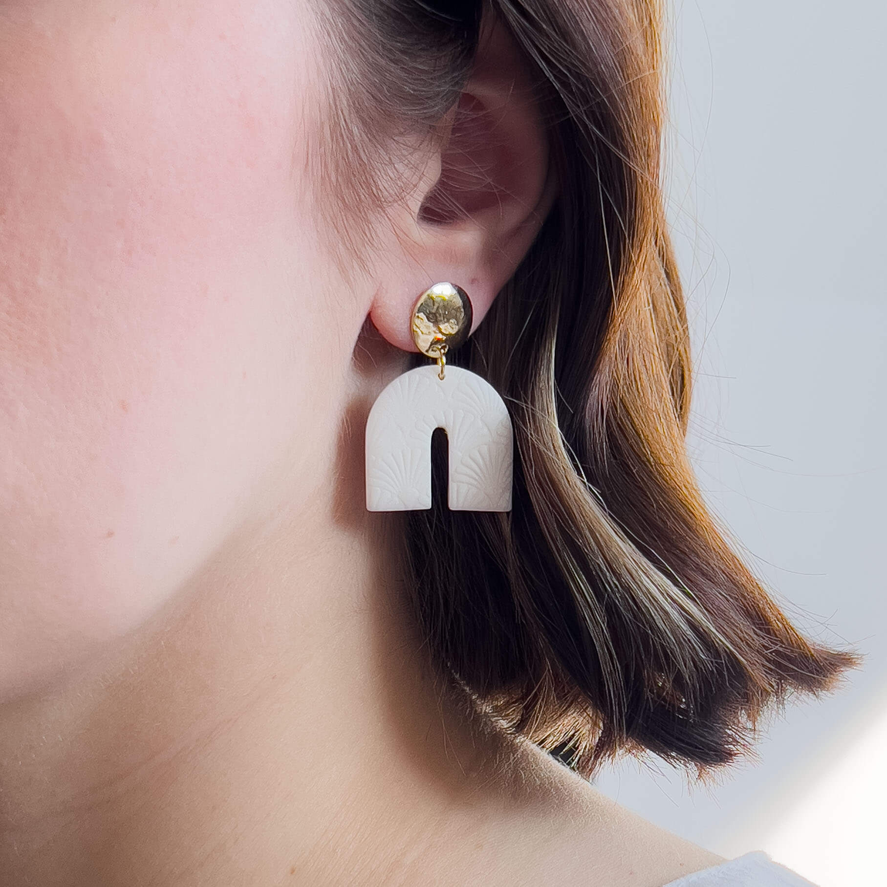 Diese Bogen-Ohrringe bestechen durch ihre elegante, leicht glänzende perlmuttfarbene Oberfläche, verdelt mit einer wunderschönen Textur. Sie sind ein krönender Abschluss zu jedem Hochzeitskleid.