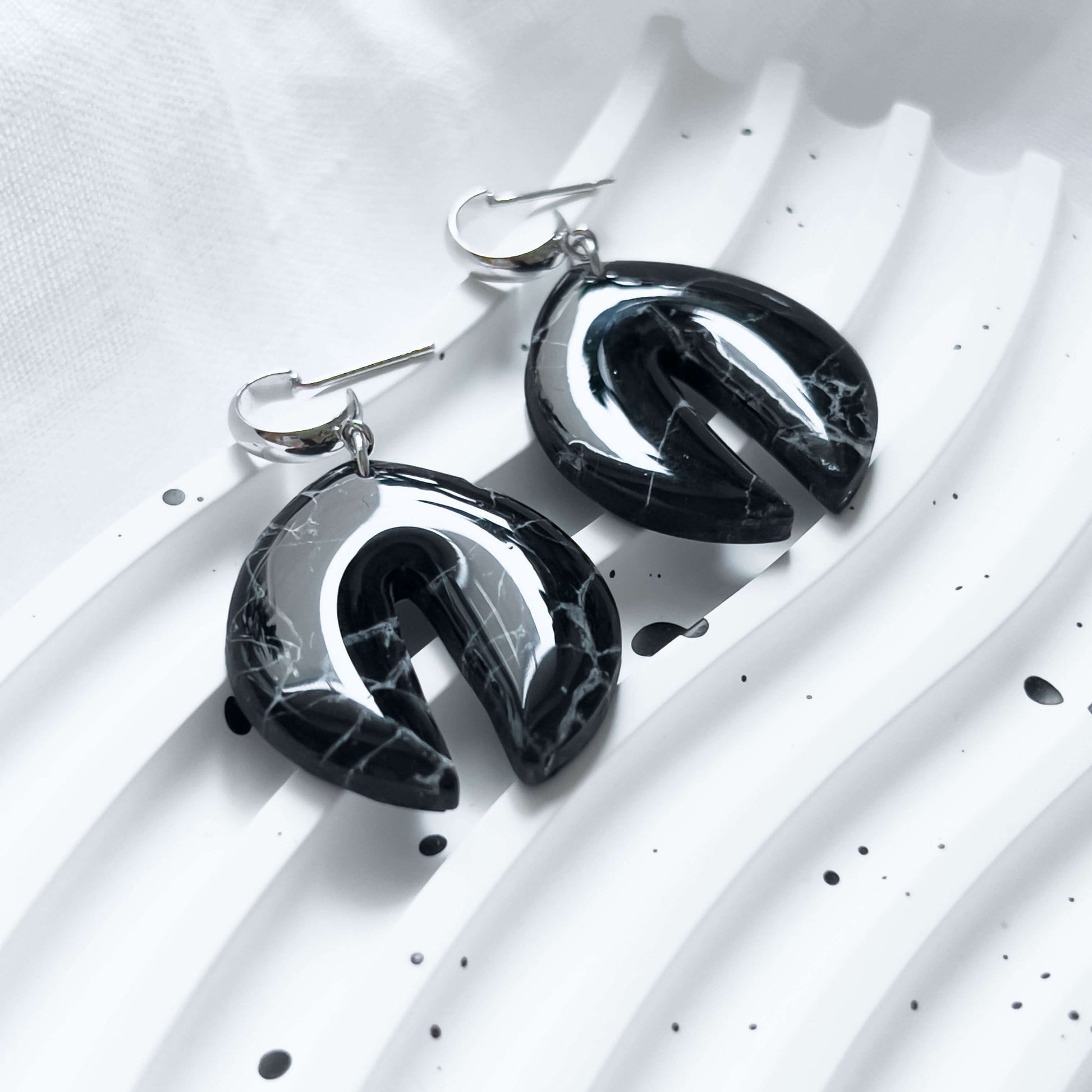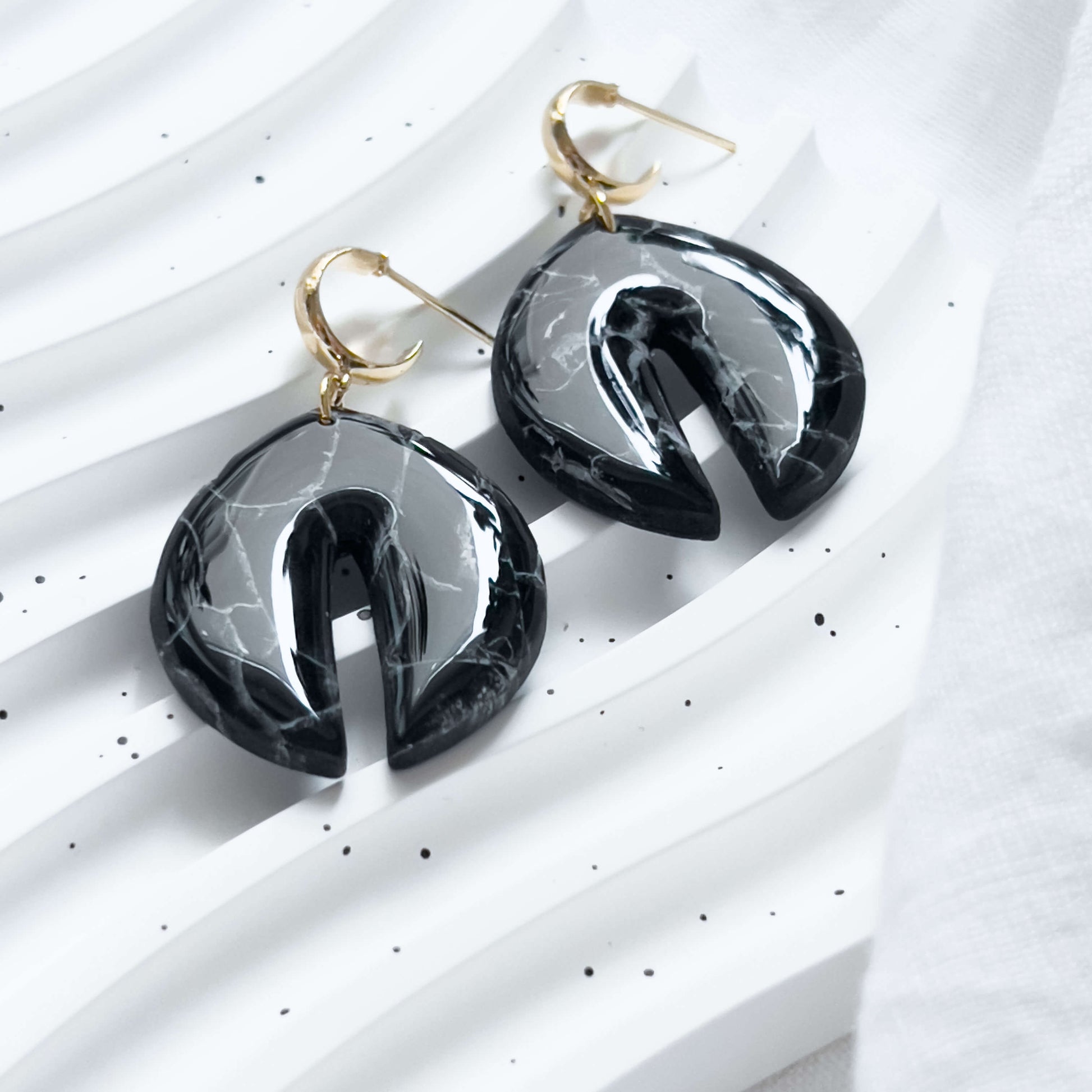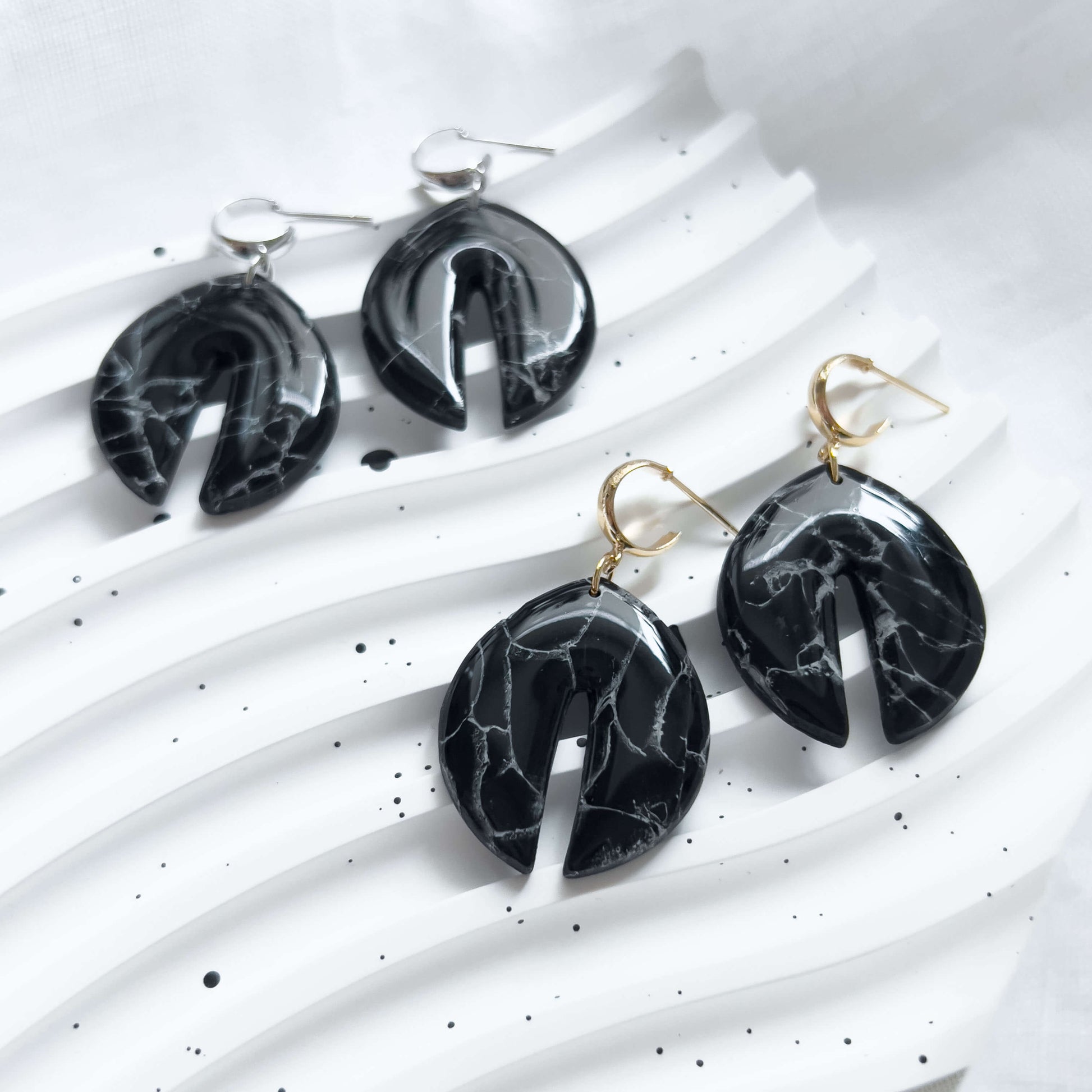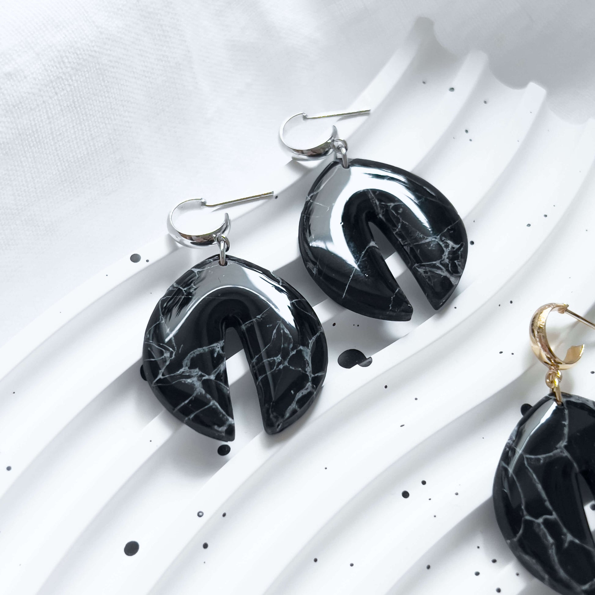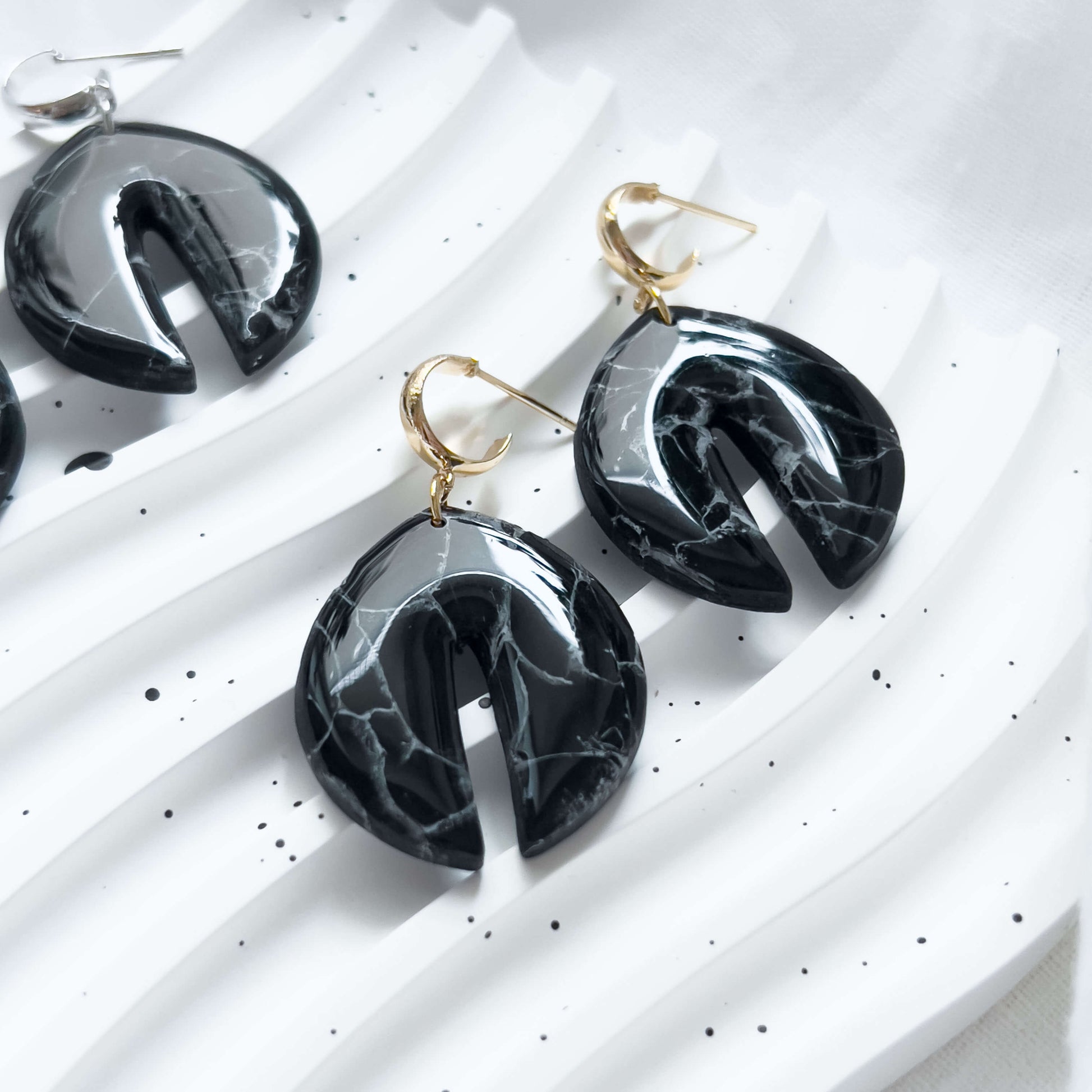 These exciting Huggie earrings nestle perfectly against your earlobe. The polymer clay pendant in black marble style is both beautiful and elegant 🖤