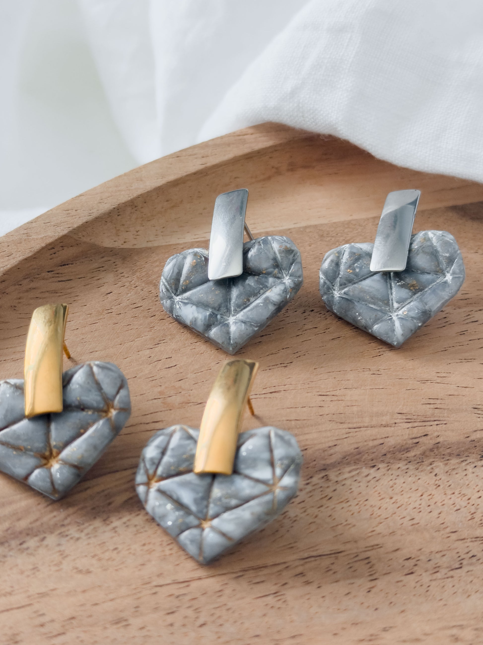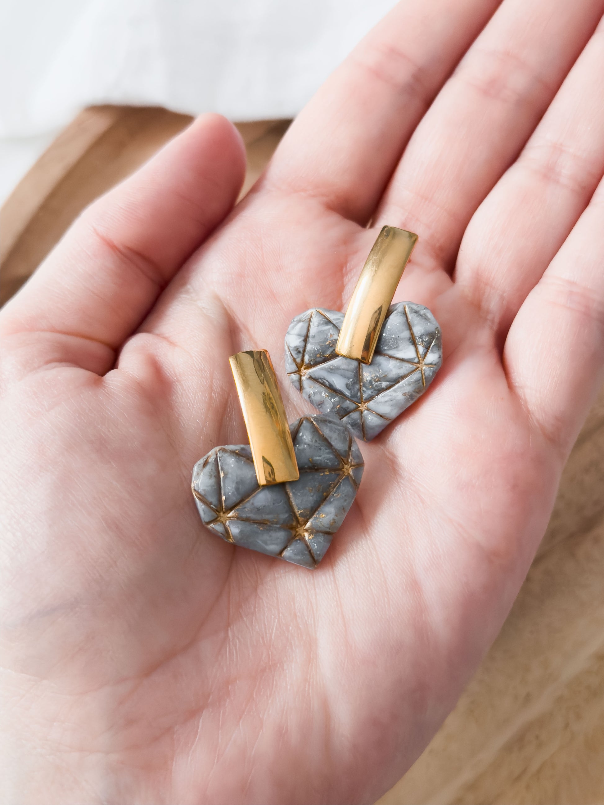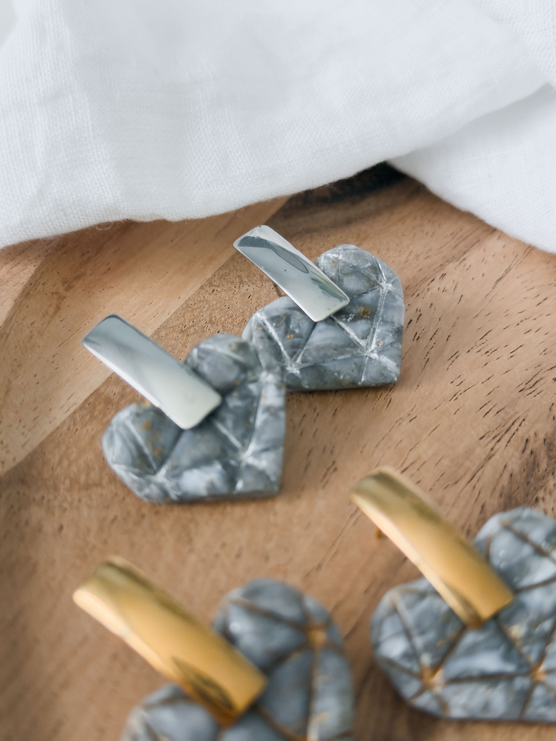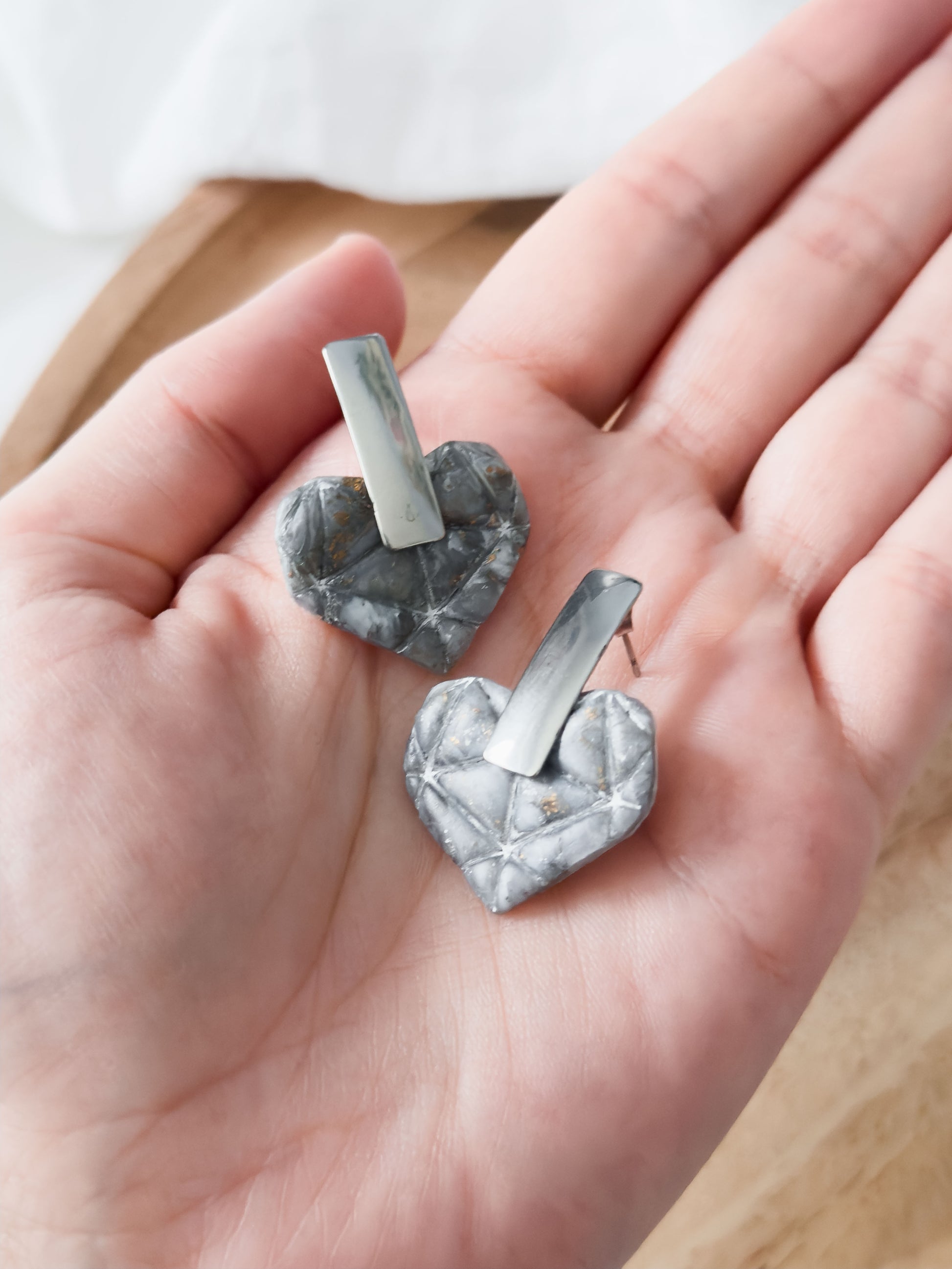 Love lasts forever – like a diamond 💎 Unsere schönen Diamant Herz-Ohrringe wurden aus grau-gold und silber marmorierten Polymer Ton erstellt. Das Muster entsteht zufällig im Prozess, was diese Schmuckstücke noch einzigartiger macht.
