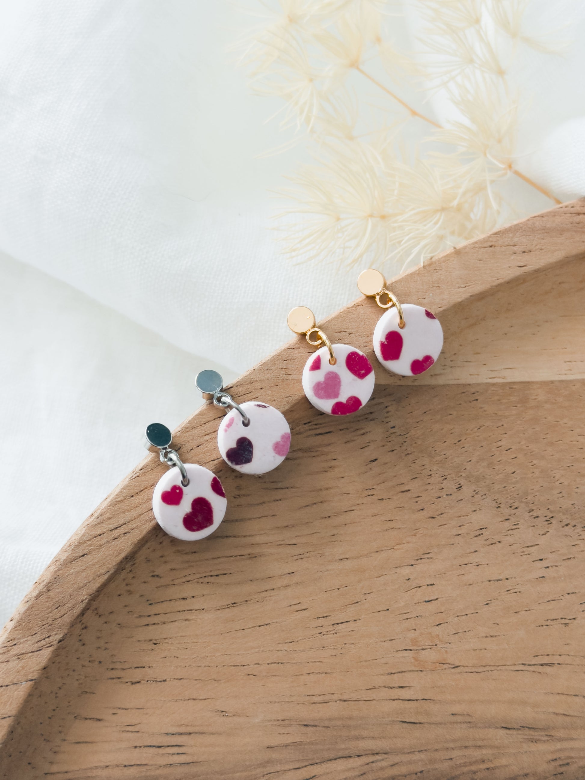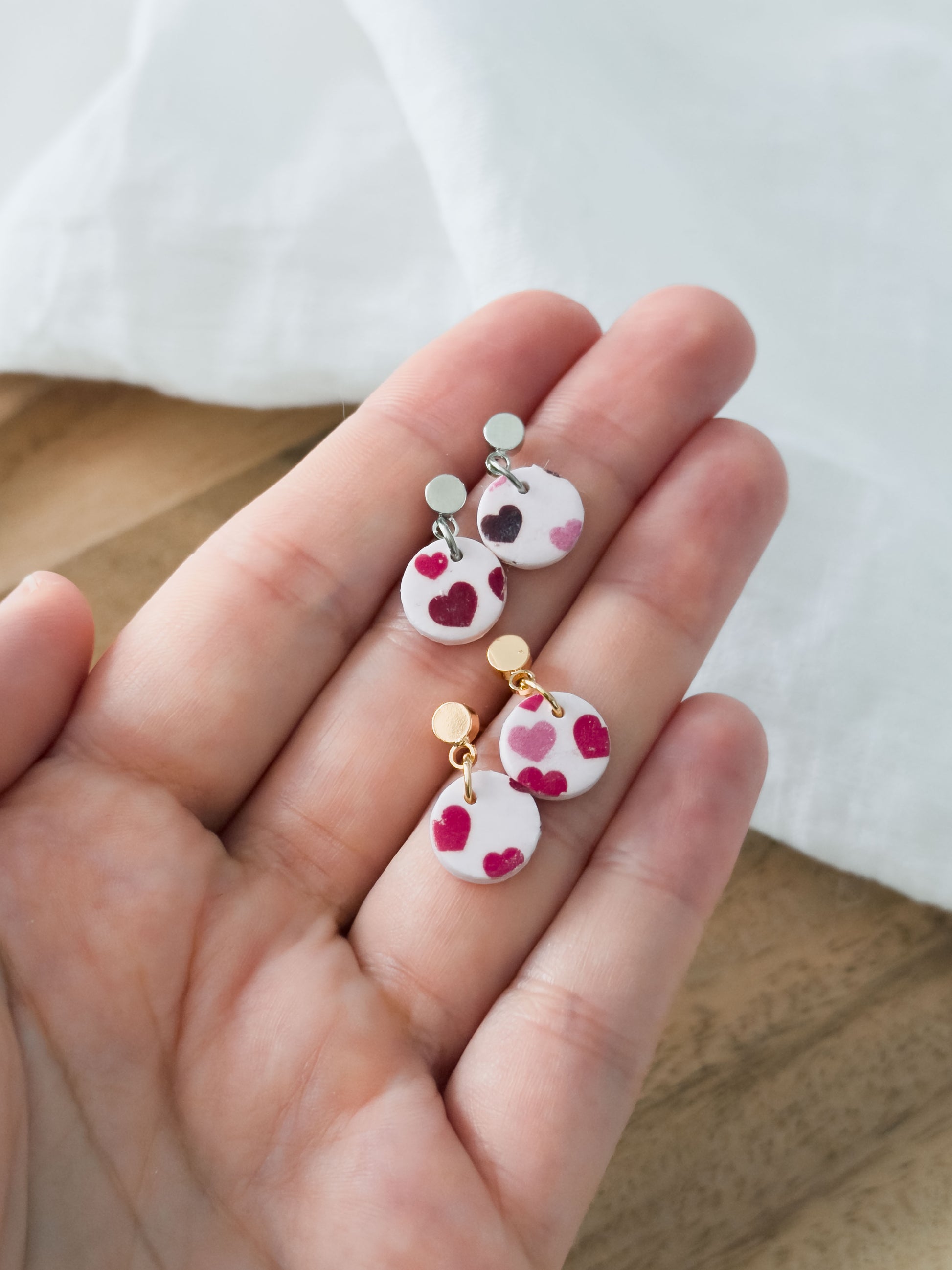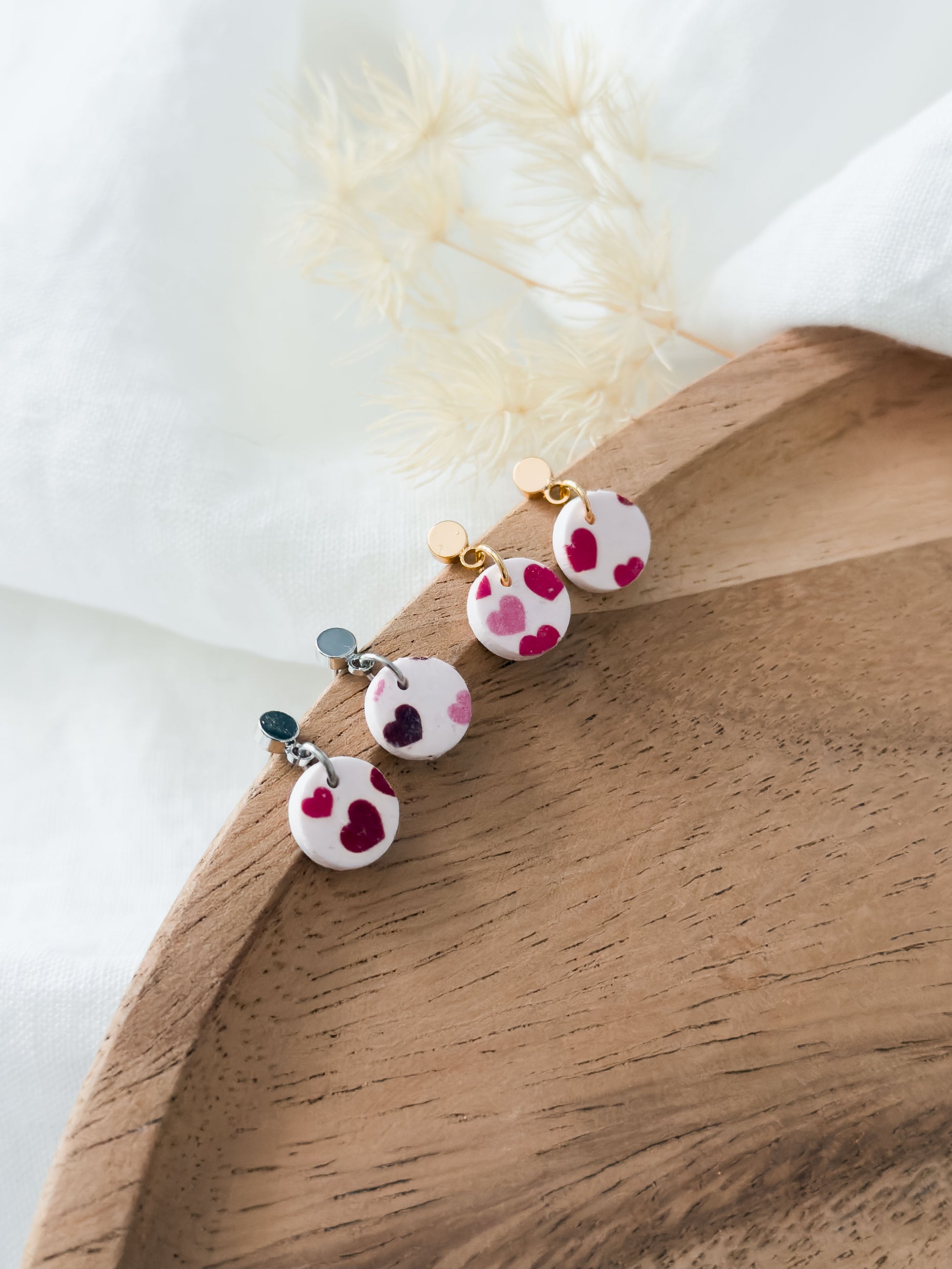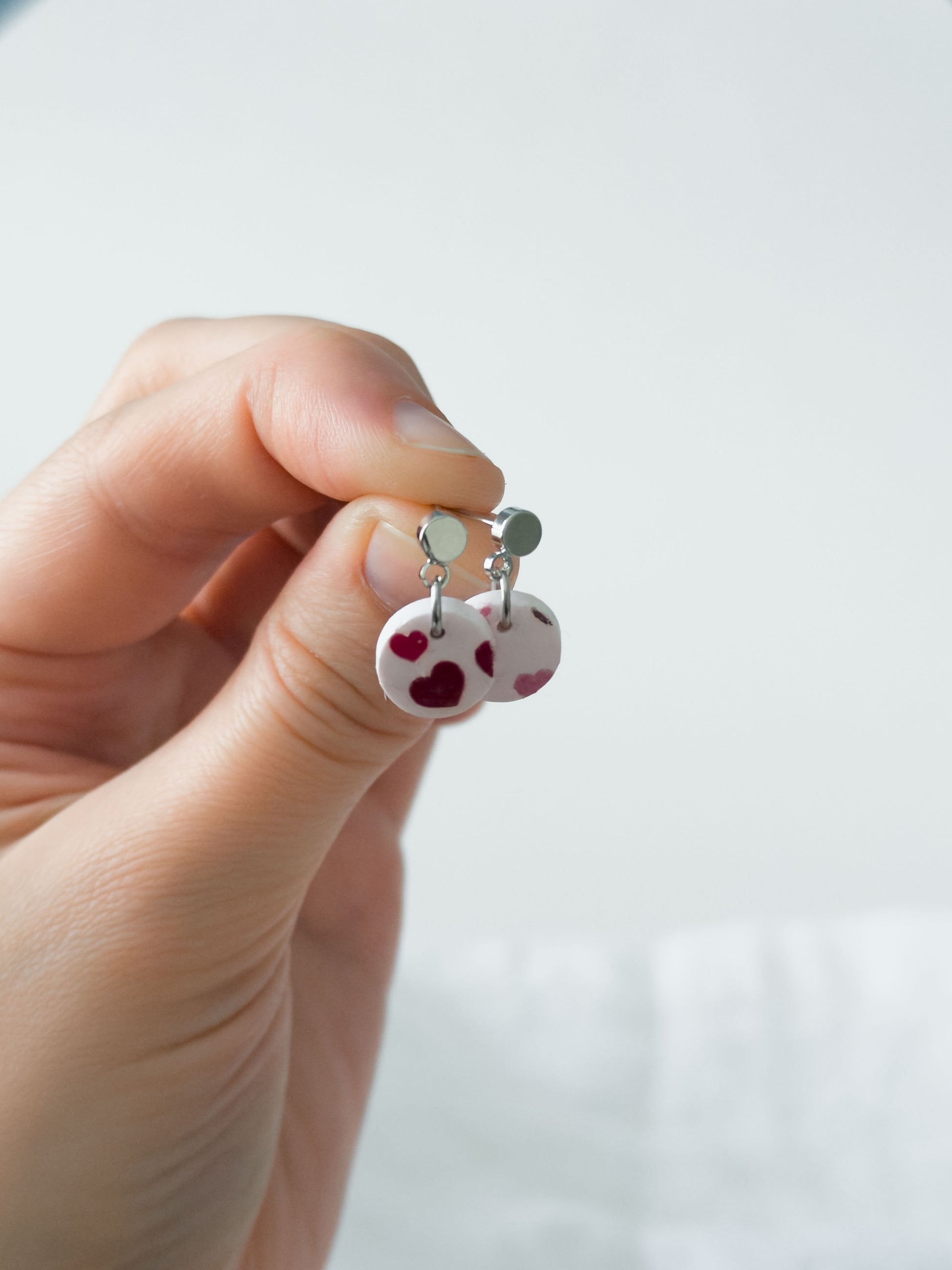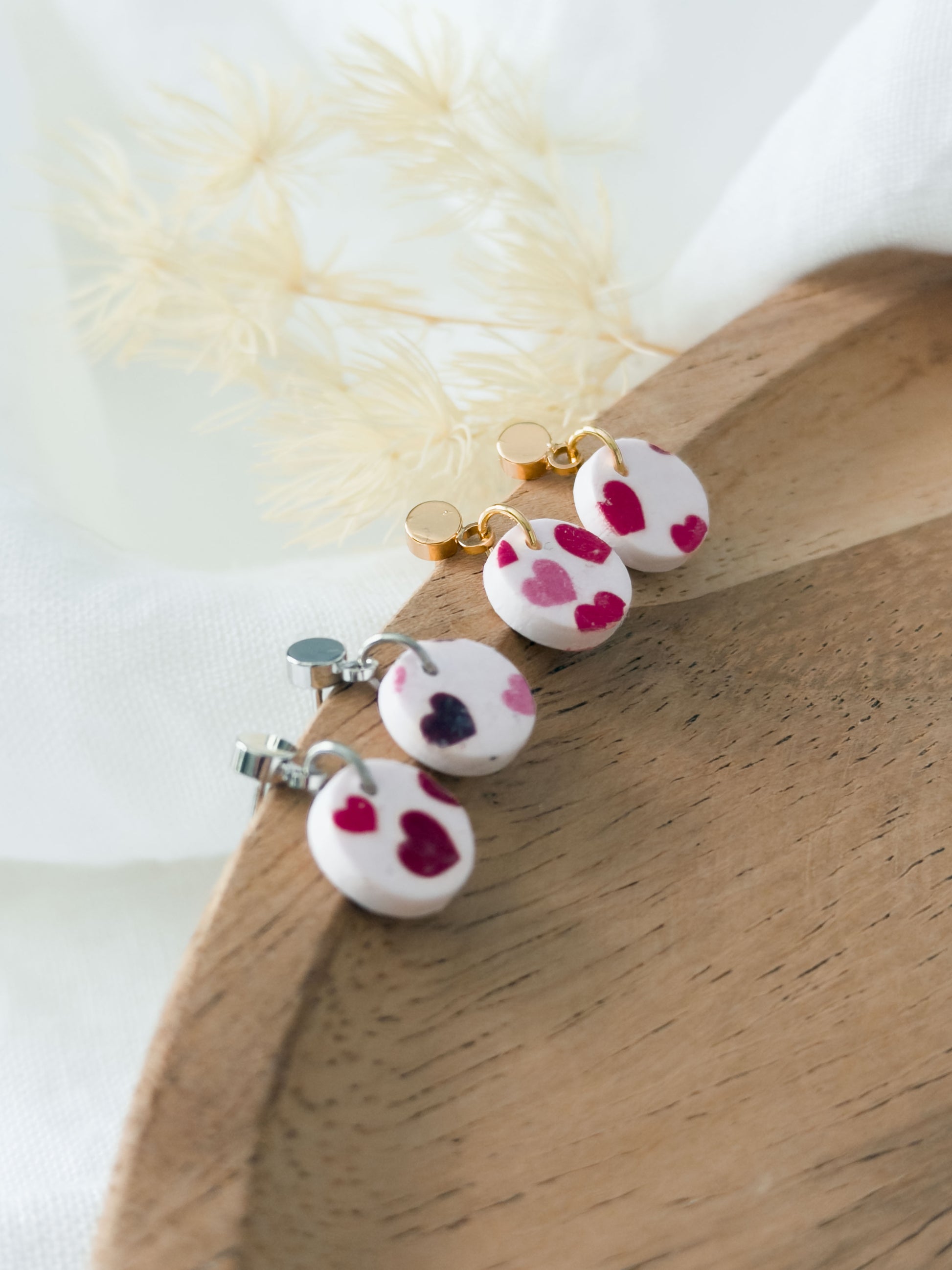 Unsere süßen ZOËs in Herzi-Edition ❤️ Das zufällige Herzchen Muster auf weißem Polymer Ton machen diese Ohrringe ein tolles Accessoire, wenn du ein bisschen mehr "whimsy" in deinem Leben brauchst.