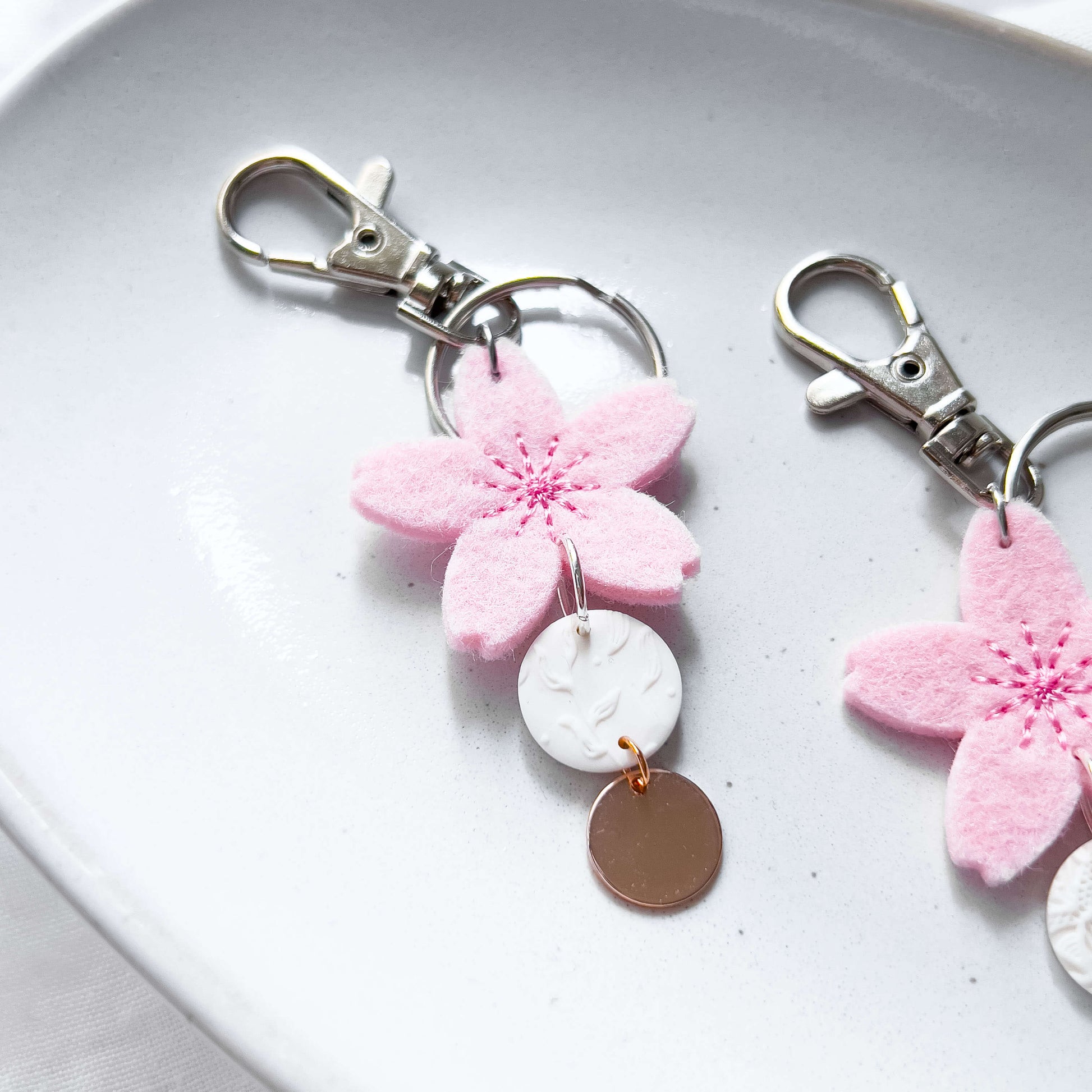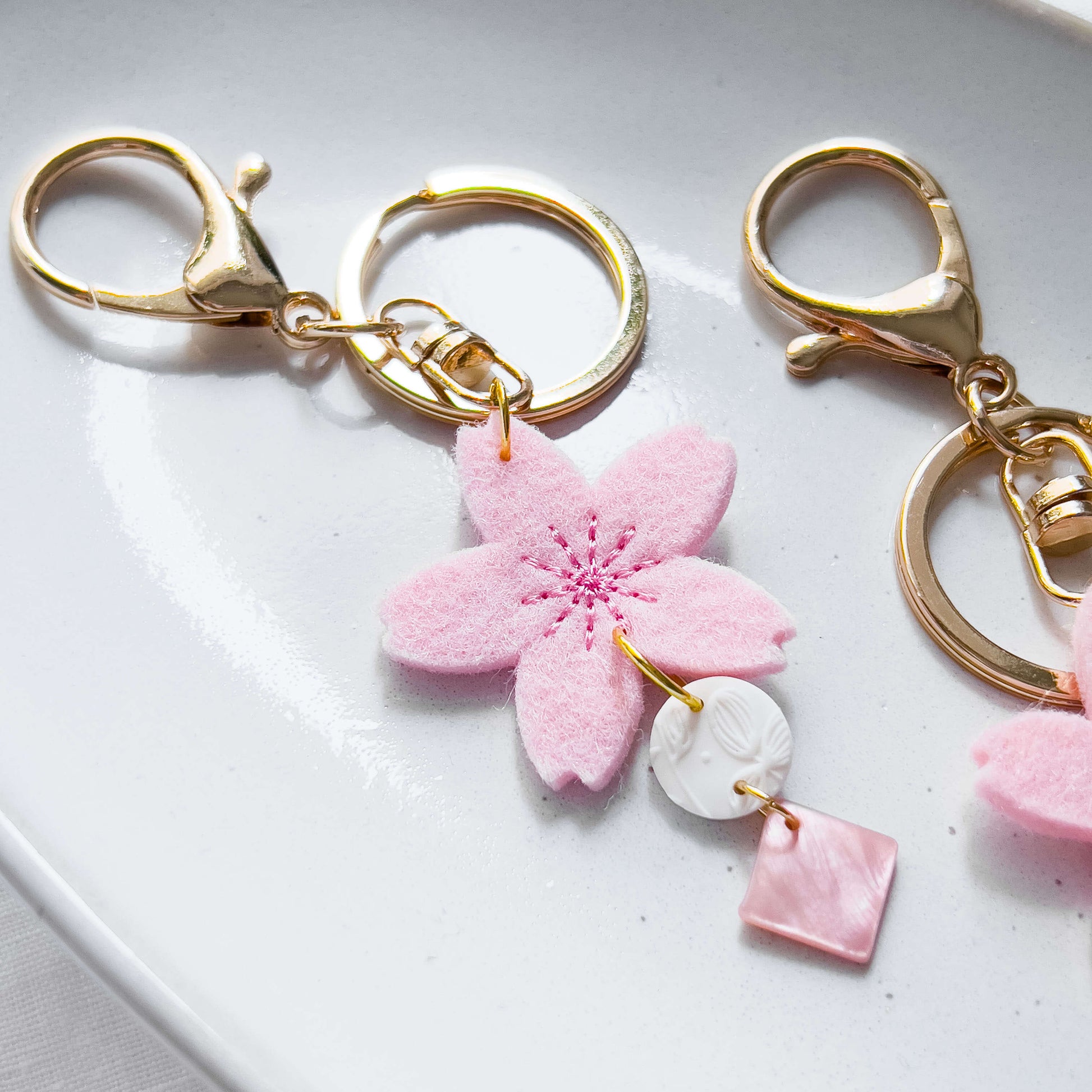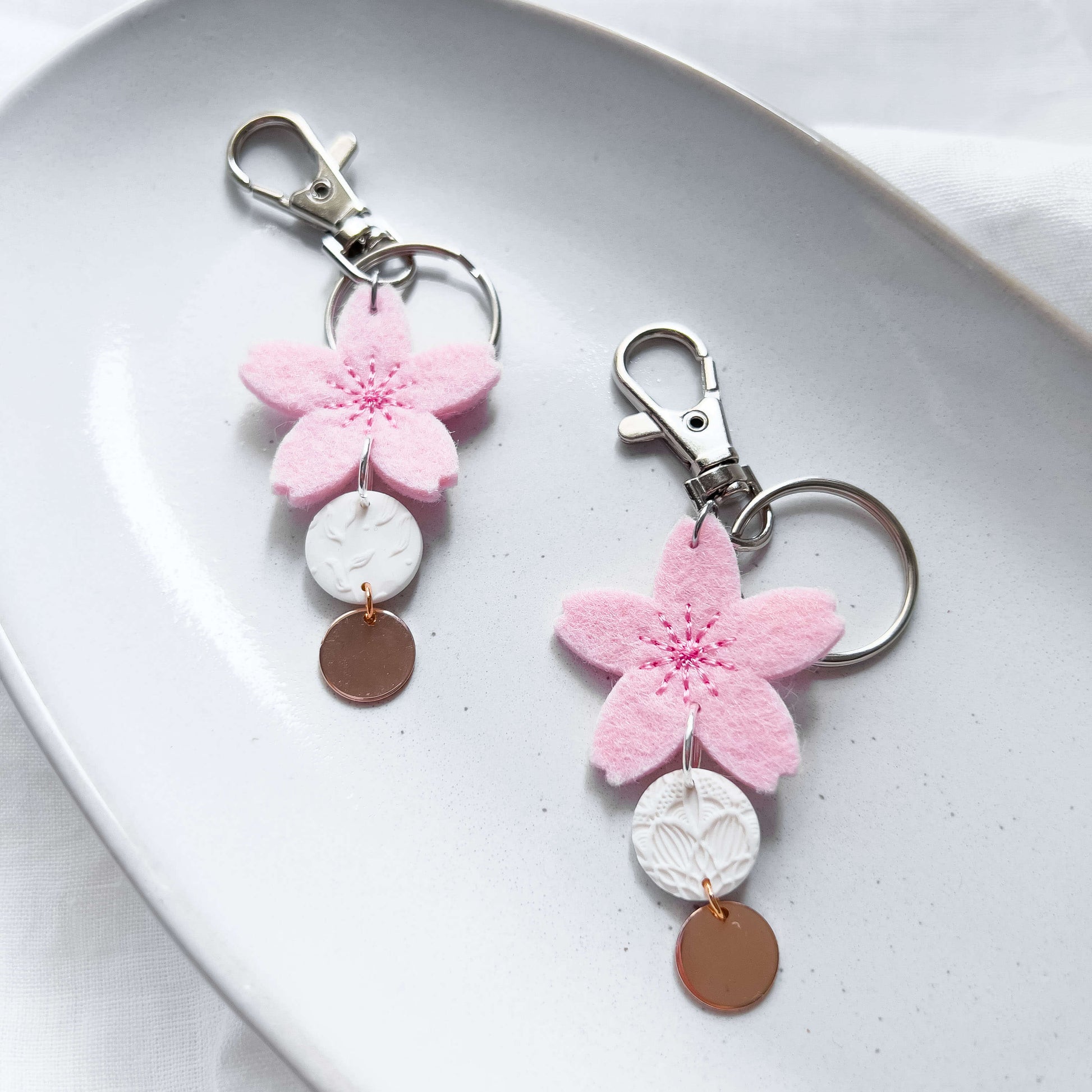 Die große Kirschblüte aus Filz gibt dir etwas zu greifen, wenn du nach deinem Schlüssel suchst. Der runde weiße Anhänger in Kombination mit einem rosafarbenen Muschelblatt bzw. roséfarbenen Plättchen runden das einzigartige Design ab.