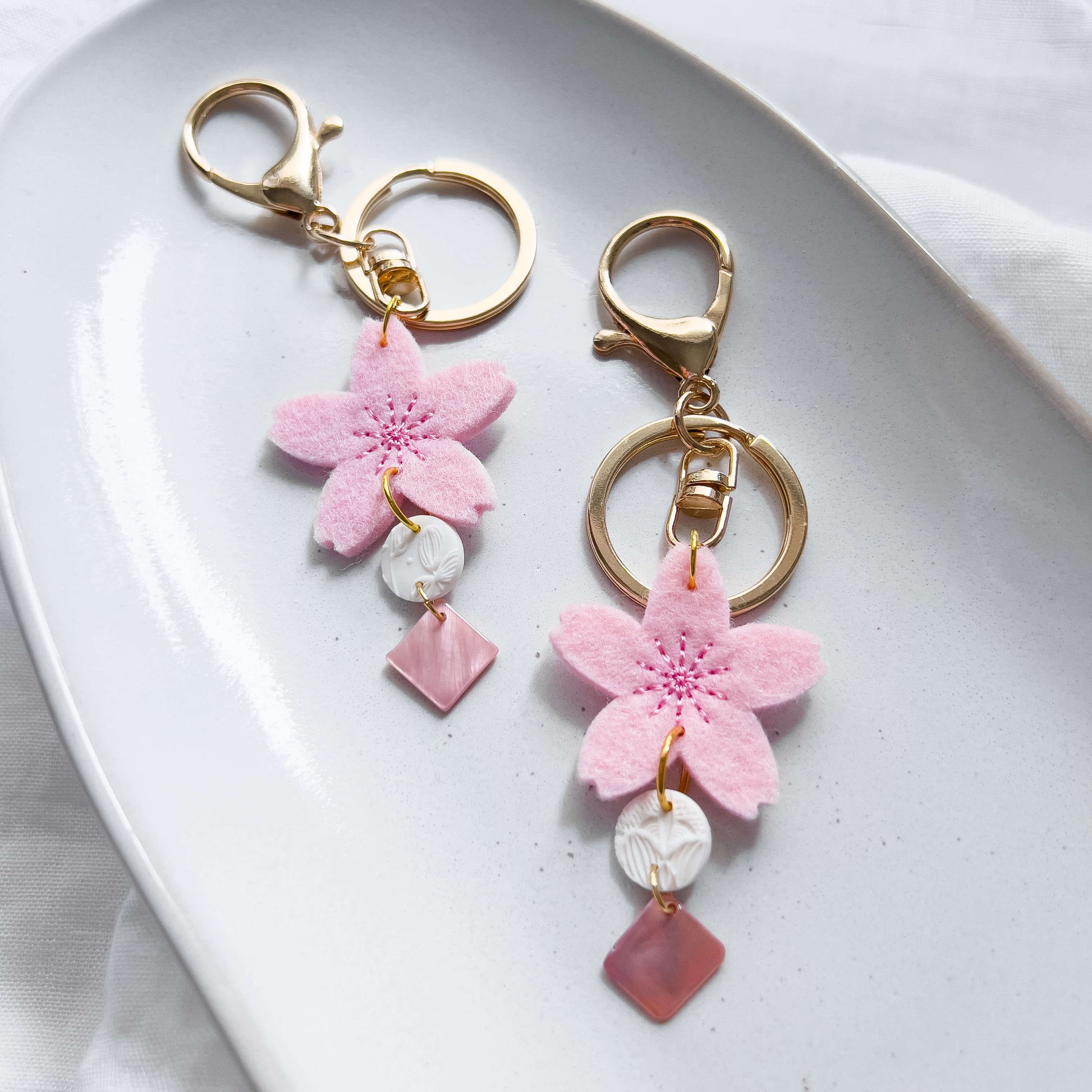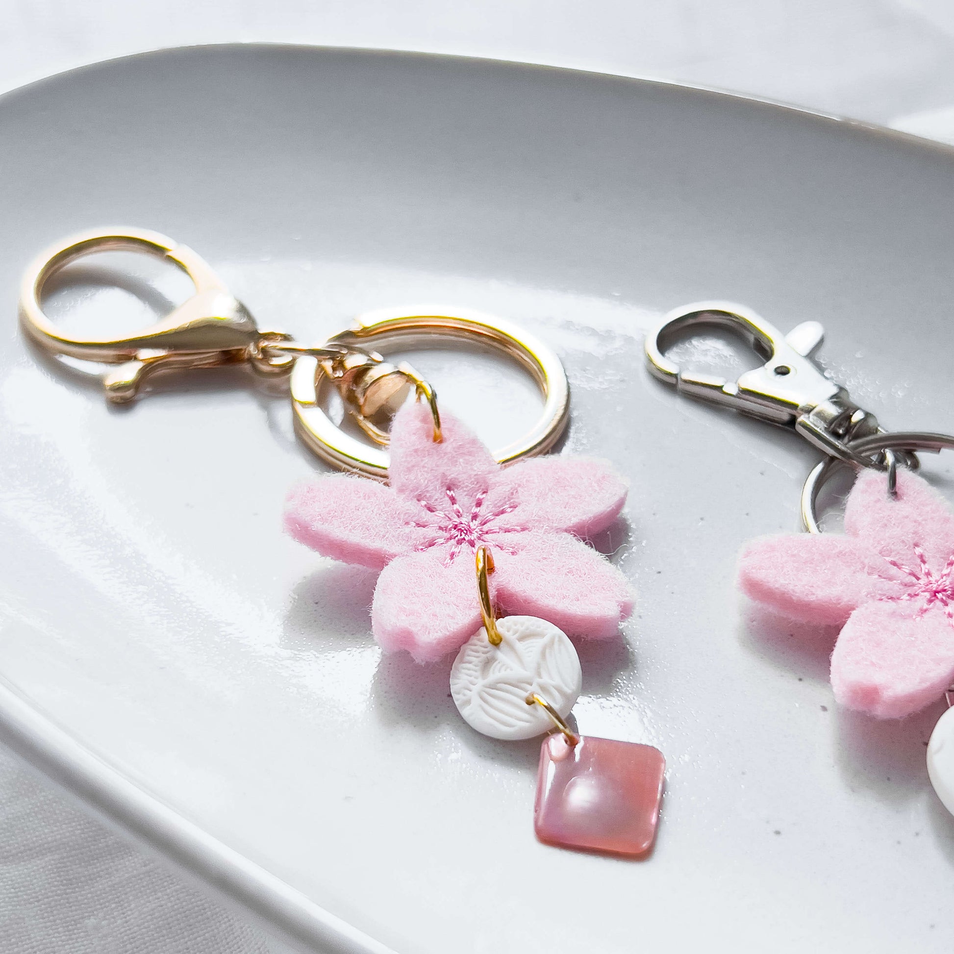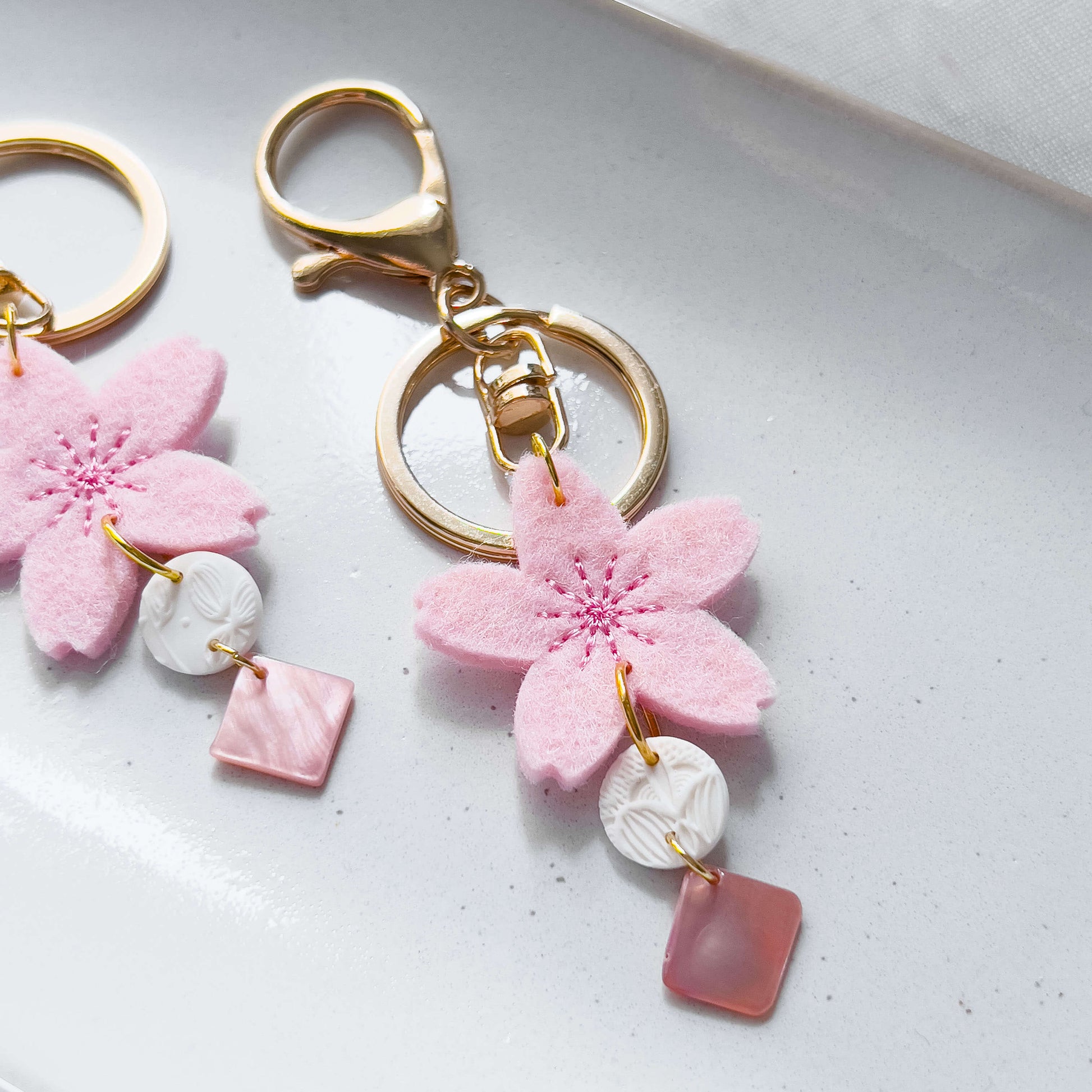 Die große Kirschblüte aus Filz gibt dir etwas zu greifen, wenn du nach deinem Schlüssel suchst. Der runde weiße Anhänger in Kombination mit einem rosafarbenen Muschelblatt bzw. roséfarbenen Plättchen runden das einzigartige Design ab.