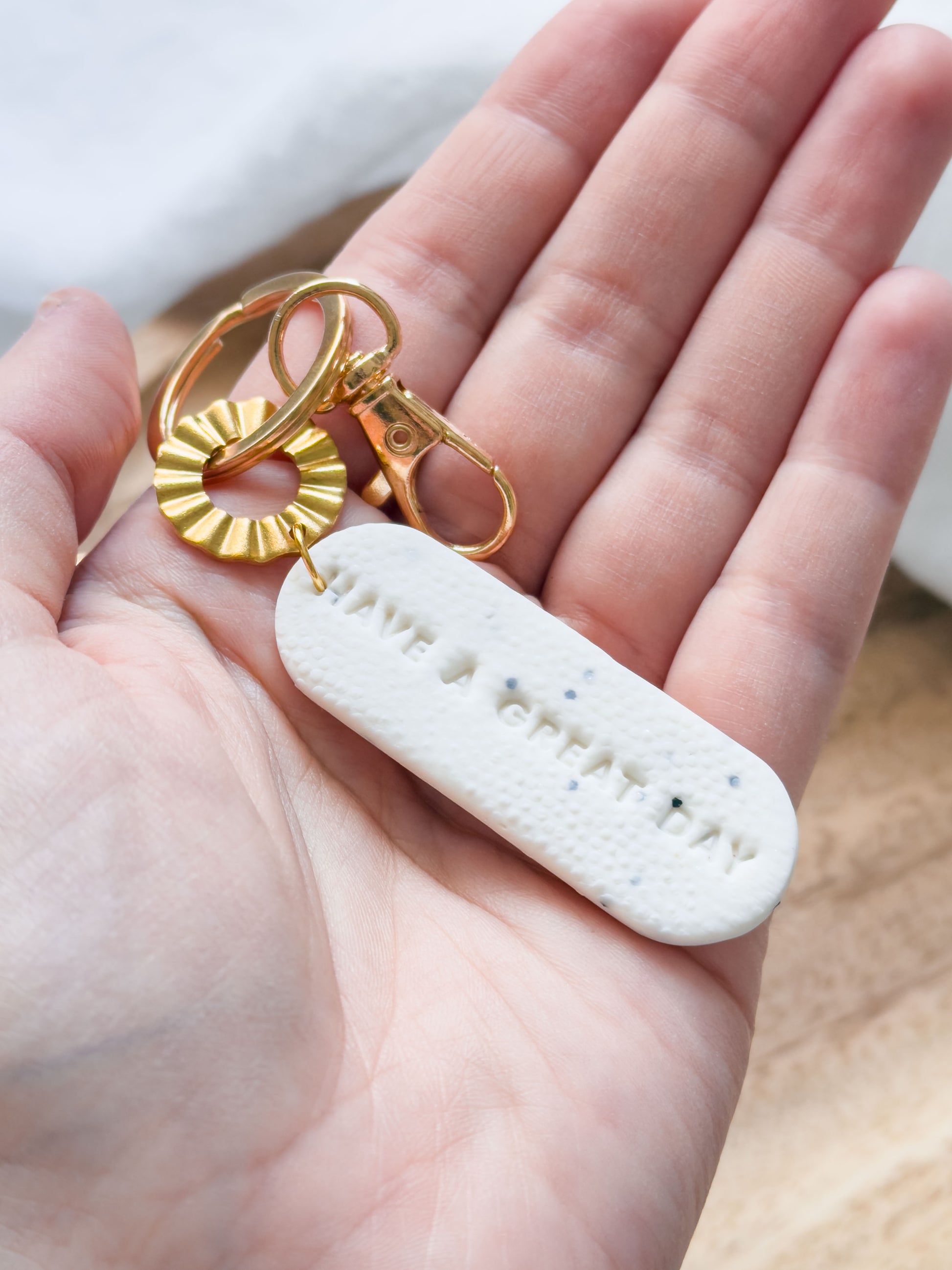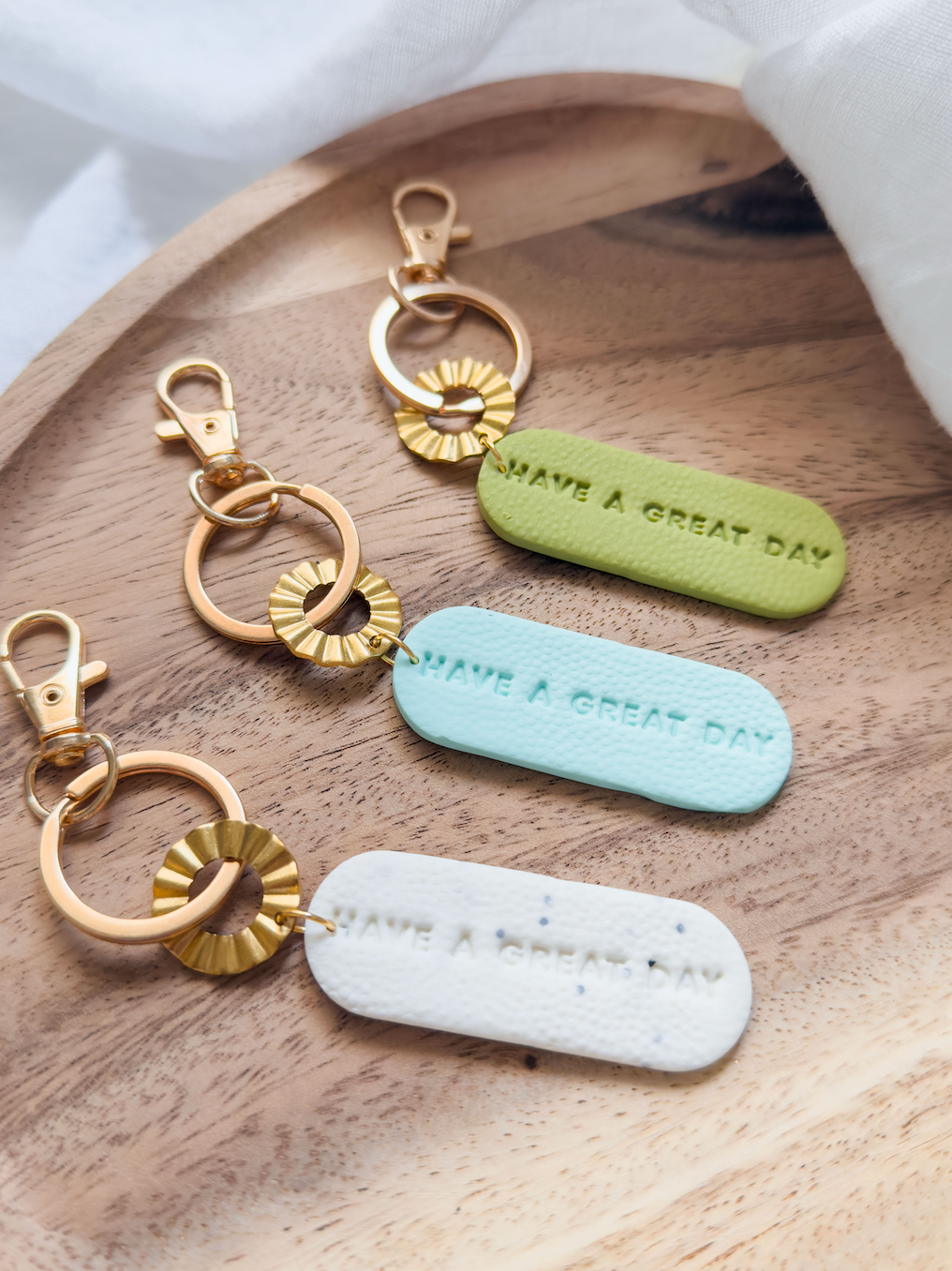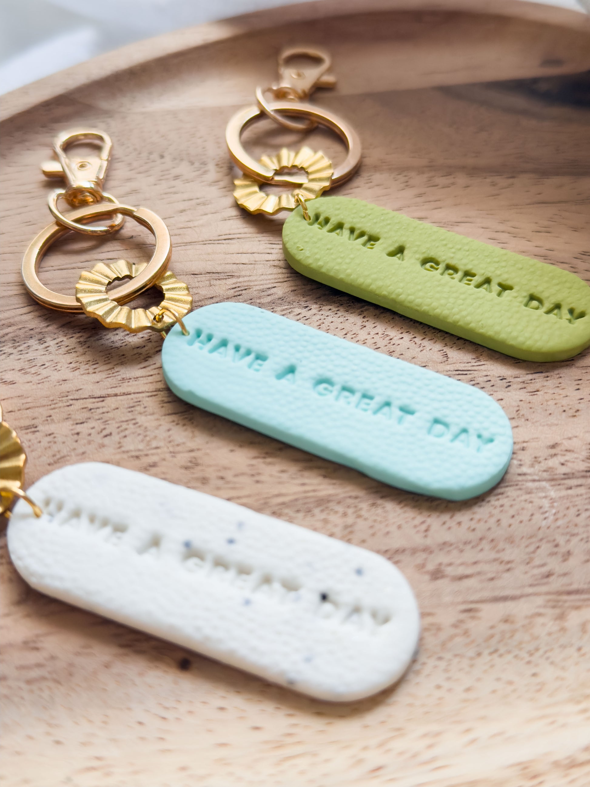 "Have A Great Day" – passender könntest du deinen Tag nicht starten, mit unseren neuen Schlüsselanhängern mit in den Polymer Ton geprägtem Spruch 🖤