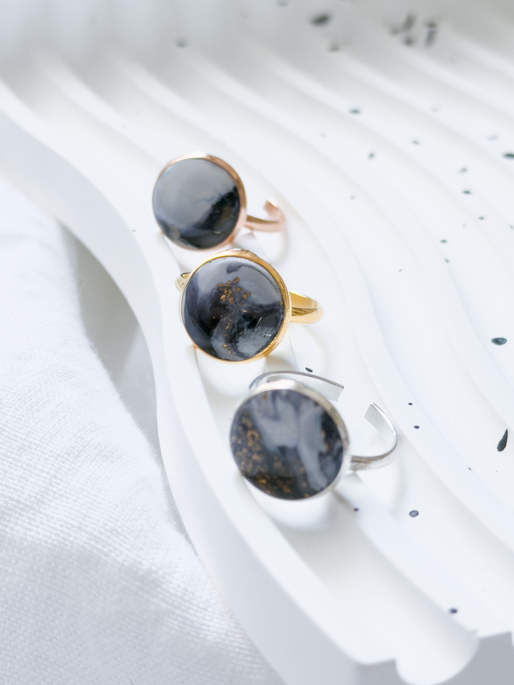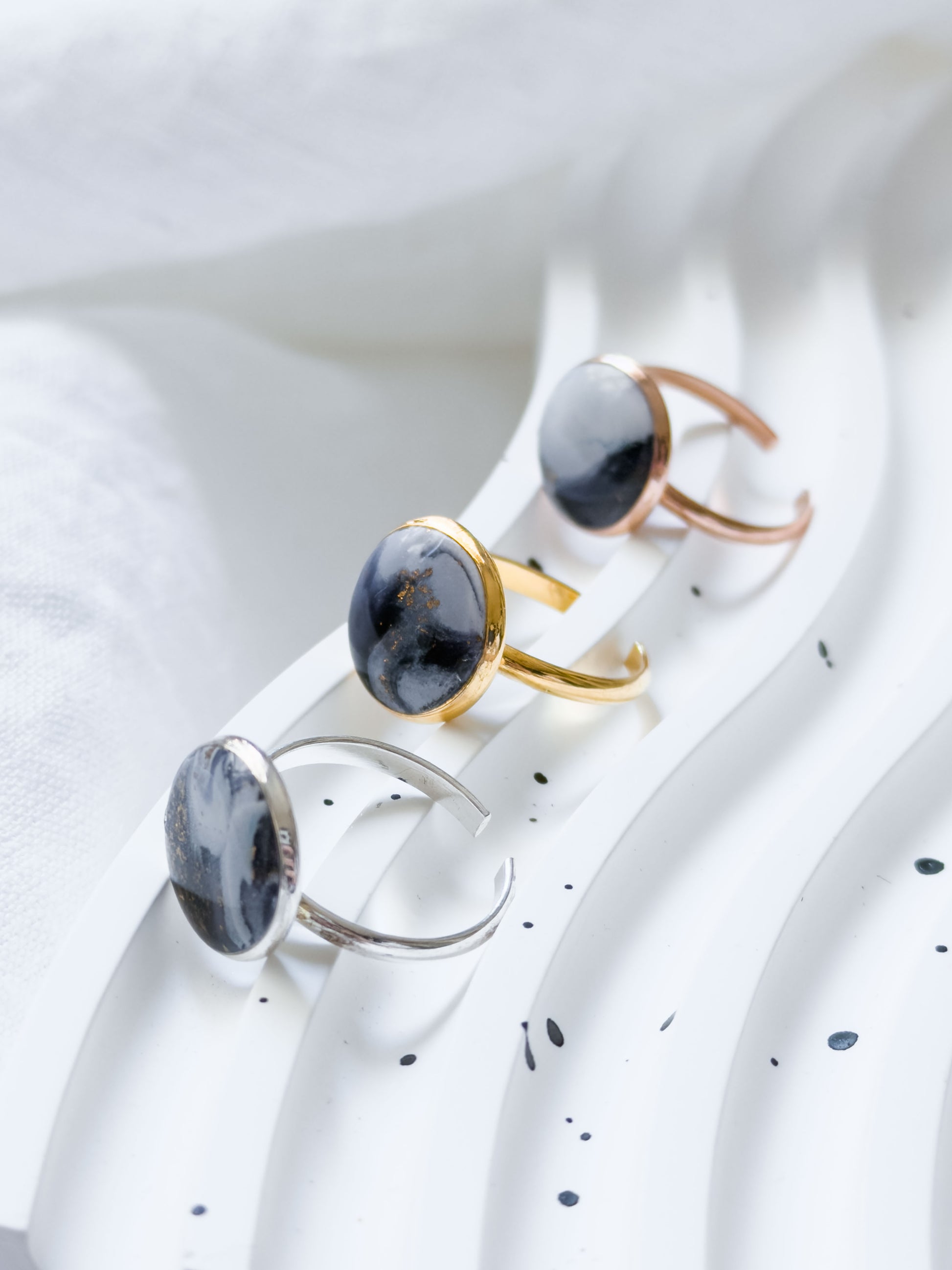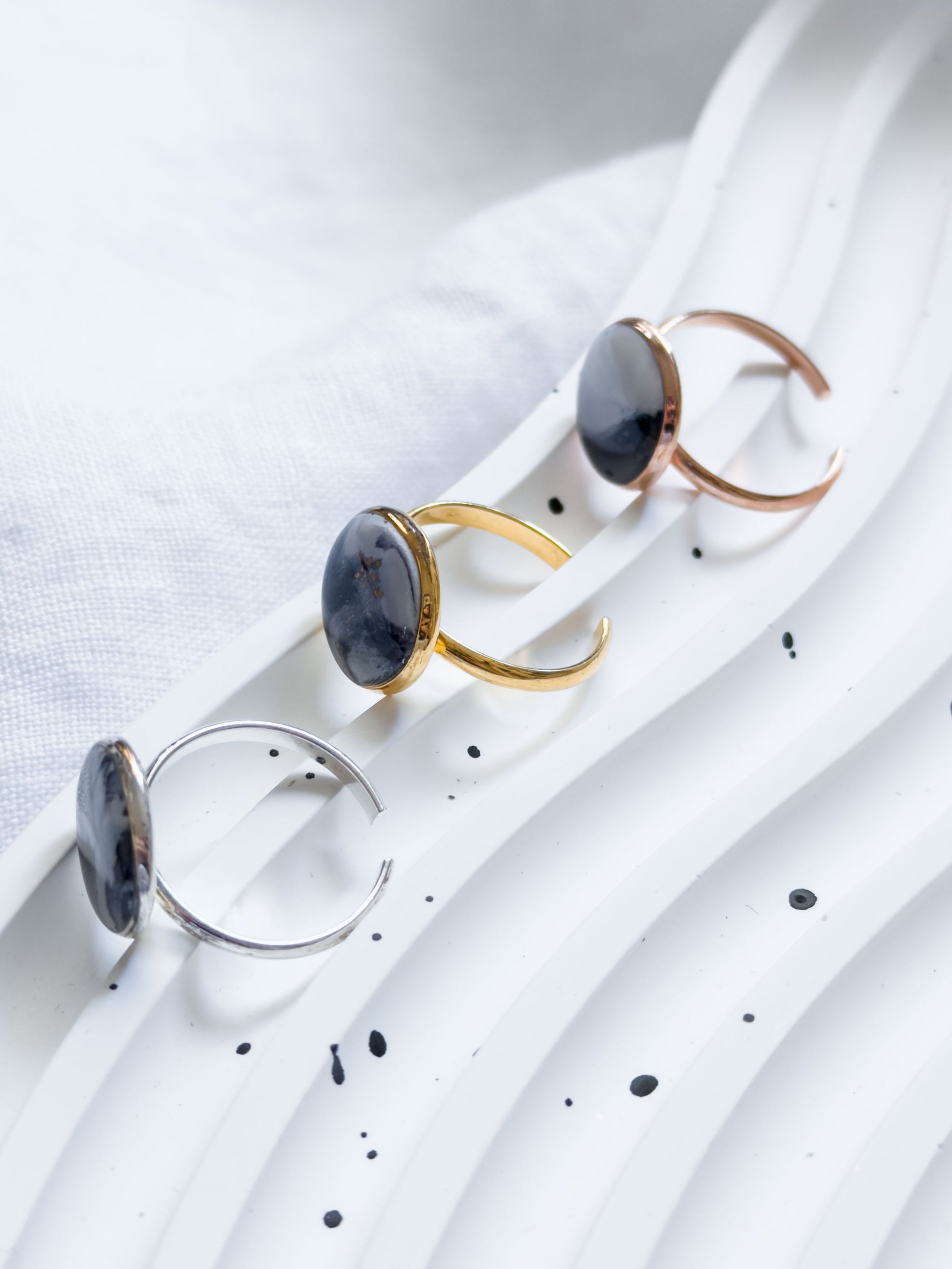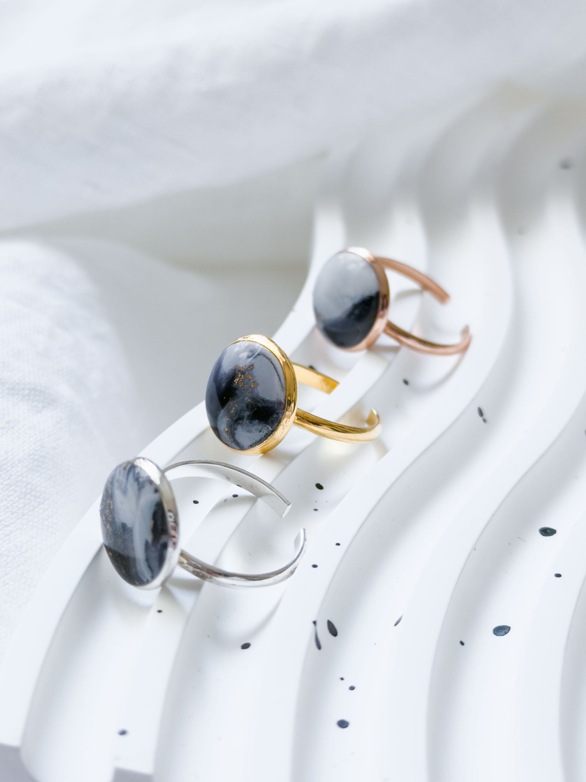 Wir kombinieren unsere Rohlinge nur mit Bedacht ausgewählten Komponenten: Z.B. Edelstahl oder 18-karätig vergoldetem oder versilbertem Messing – beides besonders gut verträglich. 🌱